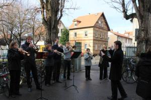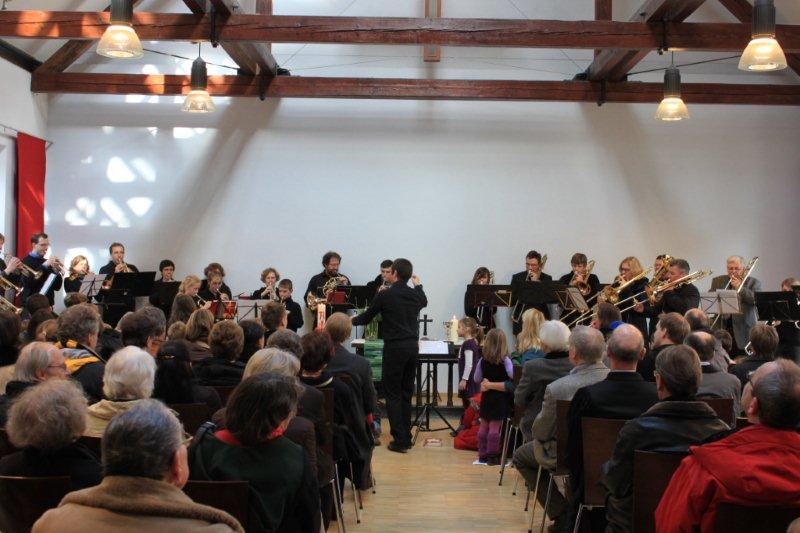 Der Posaunenchor begleitete dann den festlich-nachdenklichen Auszug der Gemeinde aus der Kirche in das Gemeindehaus. Kreuz, Taufschale, Osterkerze, Altarbibel und Abendmahlskelch wurden feierlich in den für ca. ein Jahr neuen Gottesdienstort getragen.