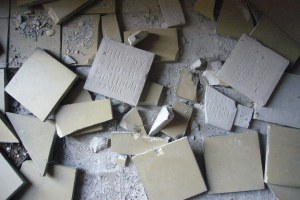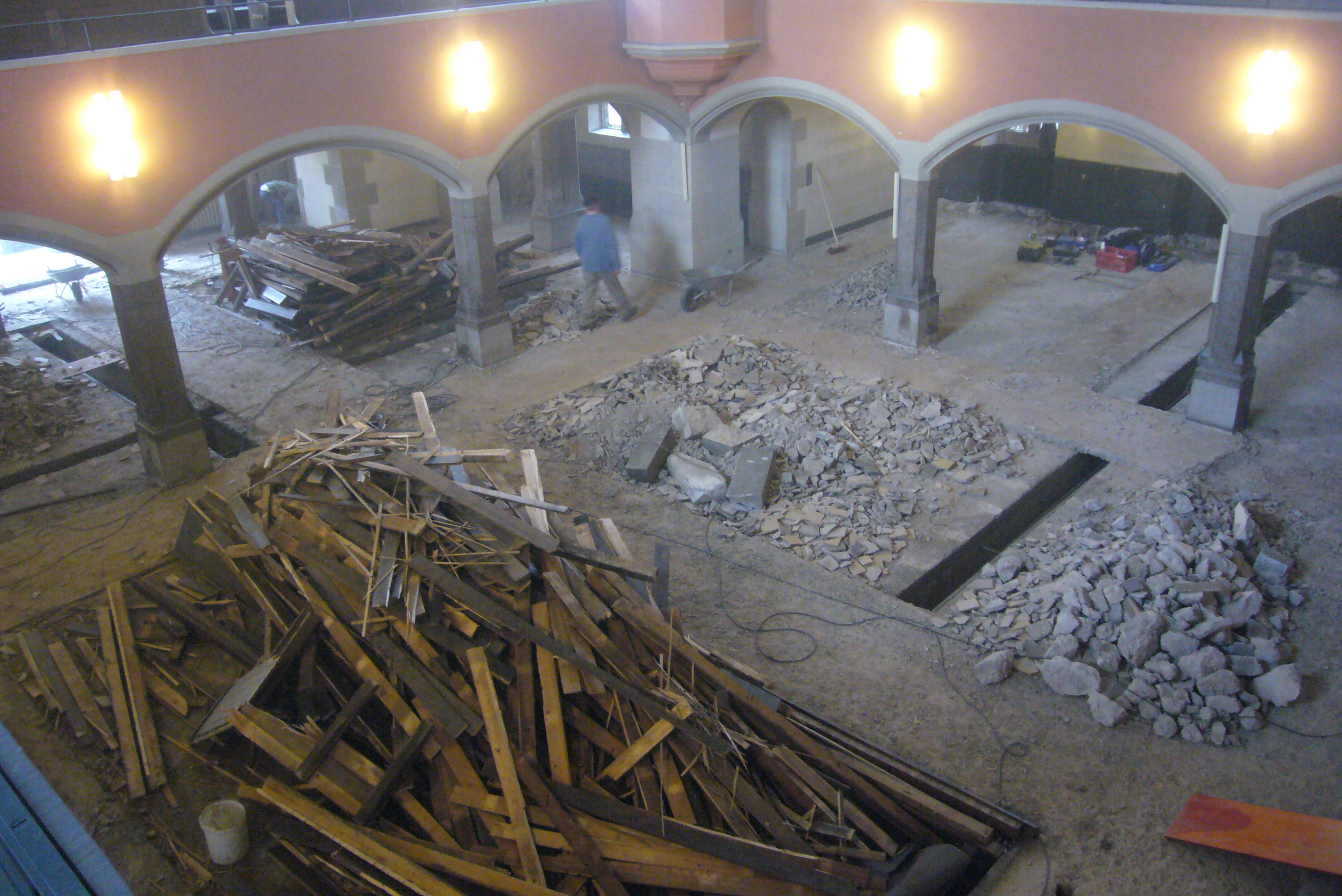 Sie werden es gehört haben. Auf dem Weg zum Markt tönten ungewöhnliche Geräusche aus der Friedenskirche. Heute hatten die Pressluft- und Bohrhammer das Sagen: Der komplette Fussbodenbelag (Fliesen und Estrich) wurden entfernt. Ausserdem waren noch Bankpodeste abzusägen und auszubauen.