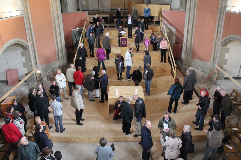 Wie wichtig die Aufstellung des 1:1 Modelles war, wurde auch in den inzwischen teilweise ausgewerteten Rückmeldebögen deutlich: Anpassungen der Breite der Stufenanlage, die Größe des Altarpodestes, die Stellung der Kanzel und Vieles mehr wurde so noch einmal im Detail diskutiert, und auch durch die Rückmeldungen sehr bestätigt.
