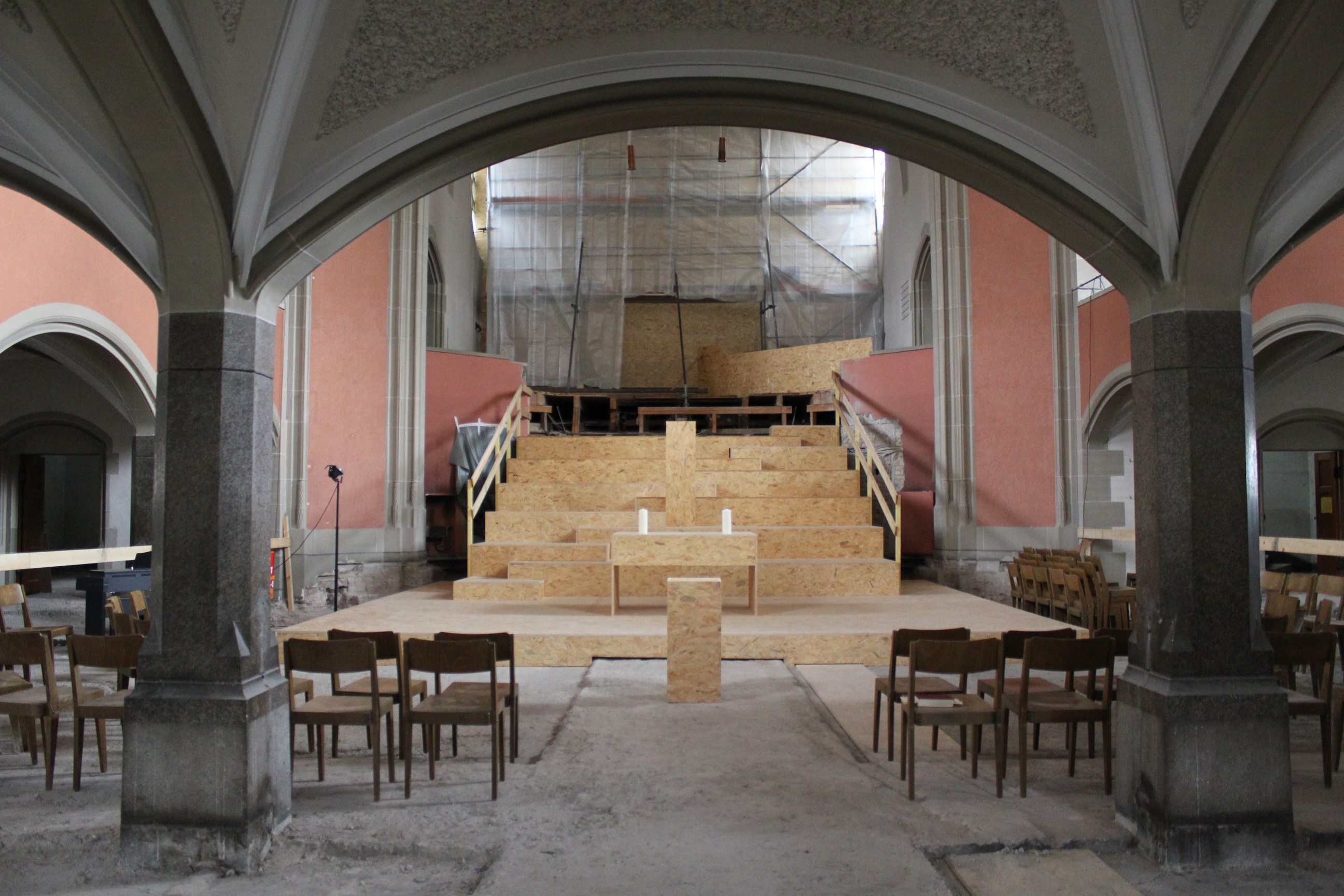 mit mobilem Ambo / mobilen Ambonen und mit „Paramenten“, also einer Gestaltung in den wechselnden Farben des Kirchenjahres (als textile Zutaten zu den Ambonen, als Teppiche oder als Lichtreflexe auf der Treppenanlage oder andere künstlerische Gestaltungsideen - den Altar als symbolischem Ort der unsichtbaren Gegenwart des Gekreuzigten und Auferstandenen