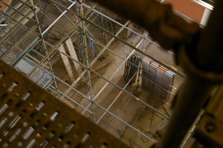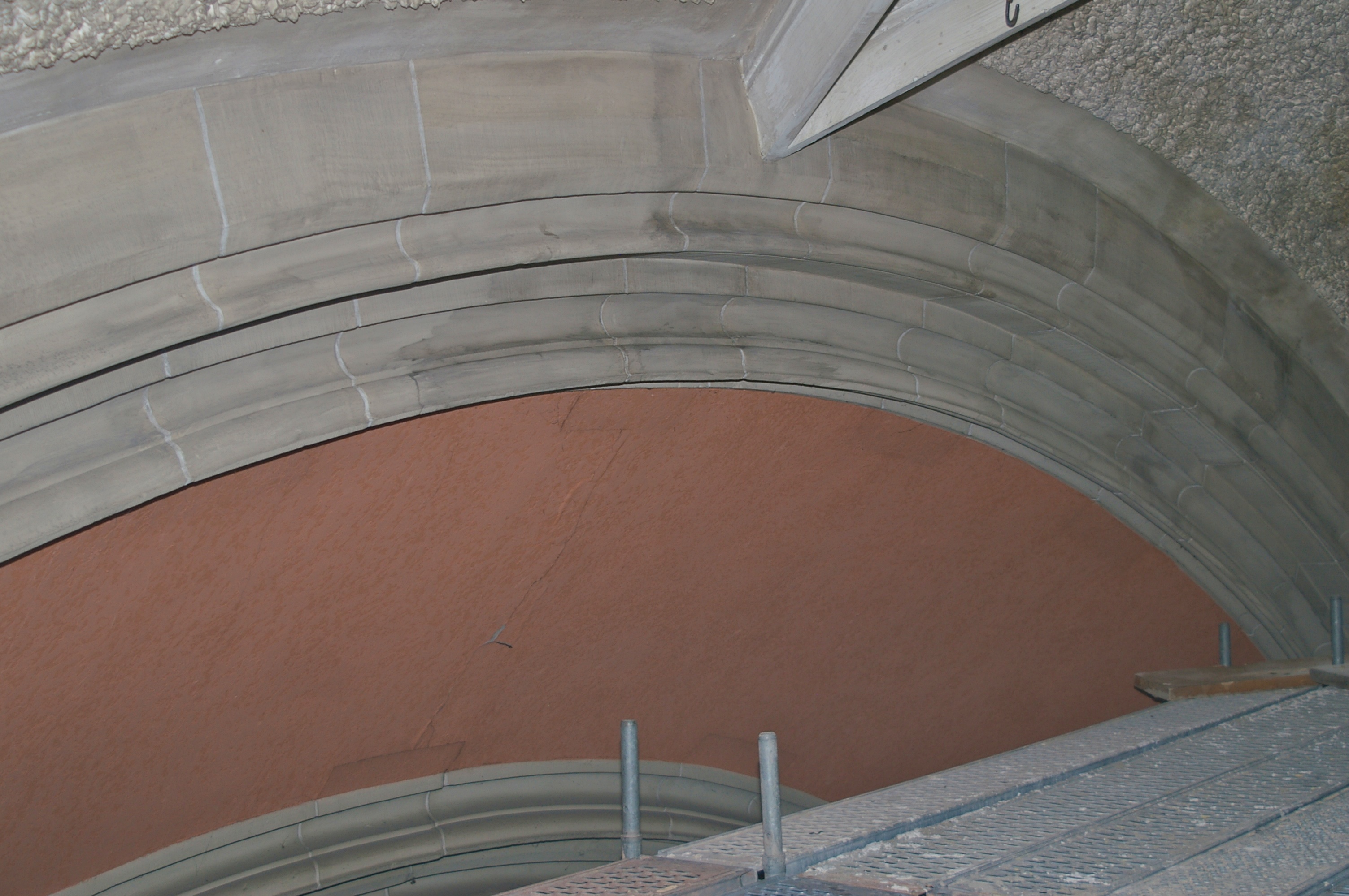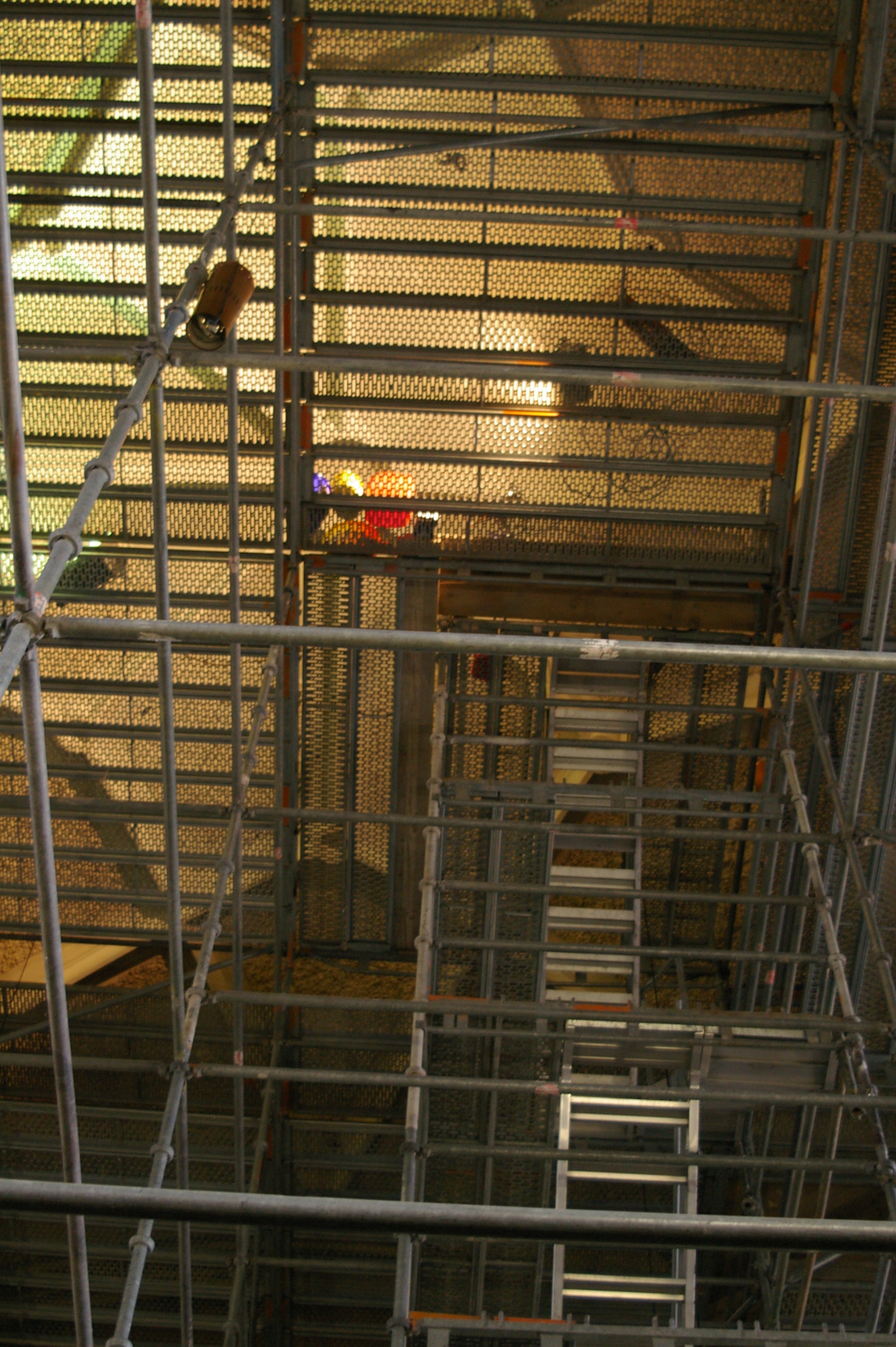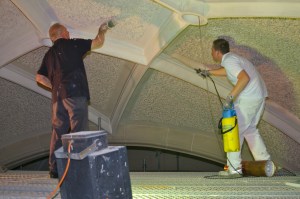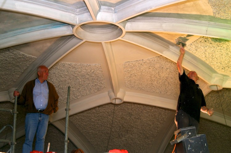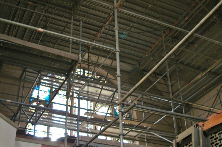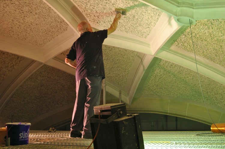 Heute gibt es mal ganz frische Bilder aus der Baustelle Friedenskirche. Nach wochenlangem Aufbau steht jetzt das Gerüst für die Malerarbeiten an den Decken. Malermeister Alfred Jakob aus Handschuhsheim und seine Leute sind bereits dabei, den Putz zu säubern und die Gewölbe hell zu streichen. Aufgetragen wird gebrochenes Weiß, eine Farbe, die dem Originalton von 1910 sehr nahe kommt. Mehrere Anstriche werden nötig sein. Bis in den September hinein werden sich die Arbeiten ziehen.
