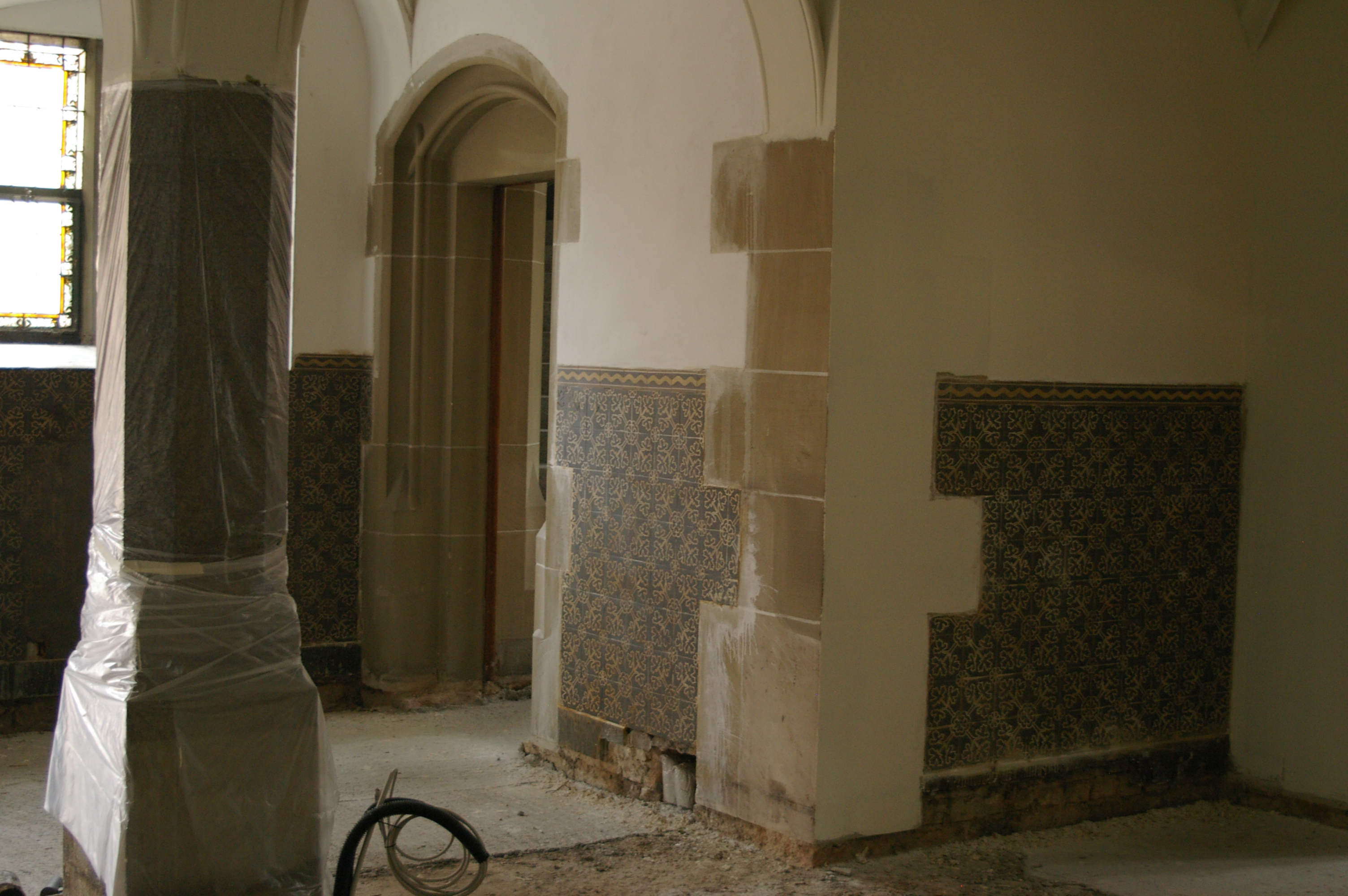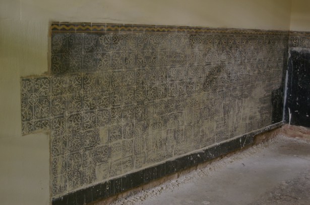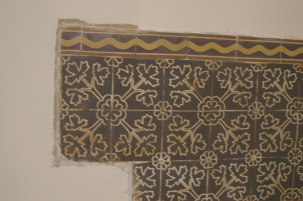 Dass die neue Friedenskirche durchaus behutsam mit ihrer Vergangenheit und Tradition umzugehen weiß, sieht man schon jetzt auf der Baustelle. Die Malerarbeiten im Haupt-Kirchenraum sind beendet. Und im Zuge dessen wurden auch die Fliesen mit dem Weinlaubmotiv an den Seitenwänden wieder freigelegt. Es stellte sich heraus, dass noch weit mehr Fliesen als ursprünglich gedacht unter dem Putz erhalten waren. Sie wurden bei der vorhergehende Renovierung 1959/60 übergeputzt. Hier ein paar Eindrücke der freigelegten Schätze:
