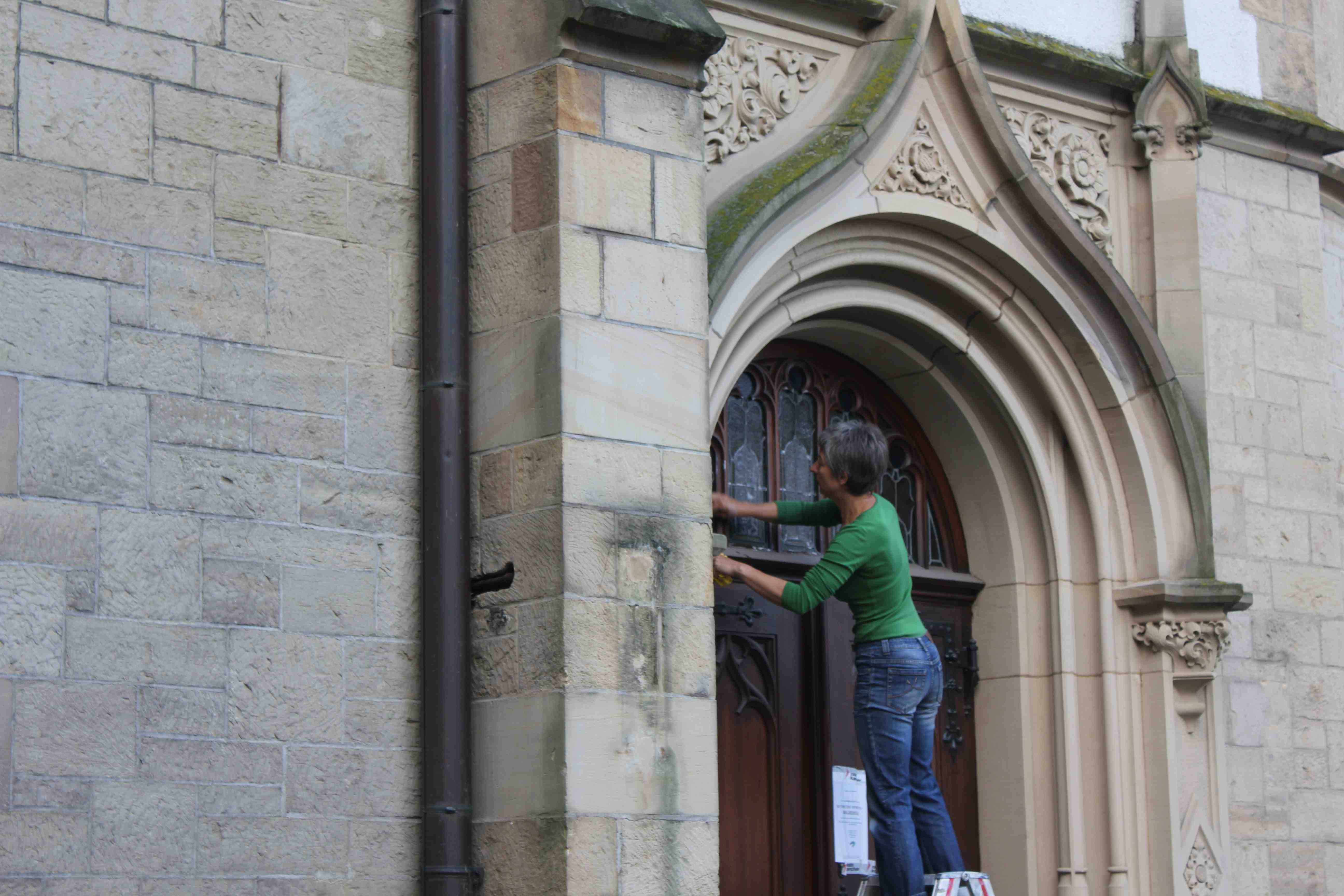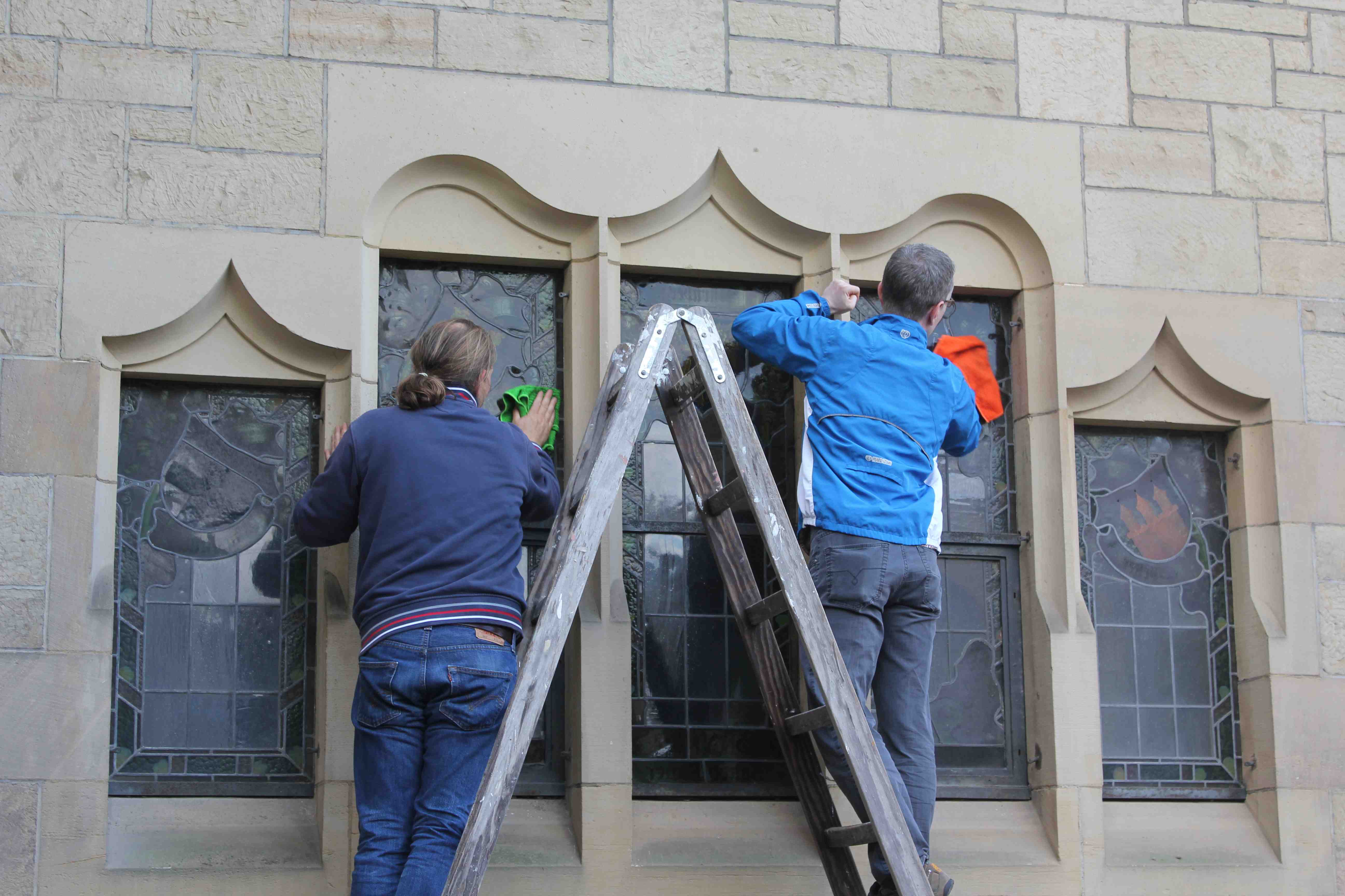 Oder „wer will fliessige Handwerker seh’n“, so war das heute in der Friedenskirche. Eine Schar Gemeindeglieder fand sich ein um die Fenster von aussen zu putzen. Das war gelinde gesagt notwendig. Ohne die Schutzgitter aussen ist das erste mal wirklich wahrnehmbar, dass die Seitenschiffe Fenster besitzen. Die Kirche ist hell geworden!