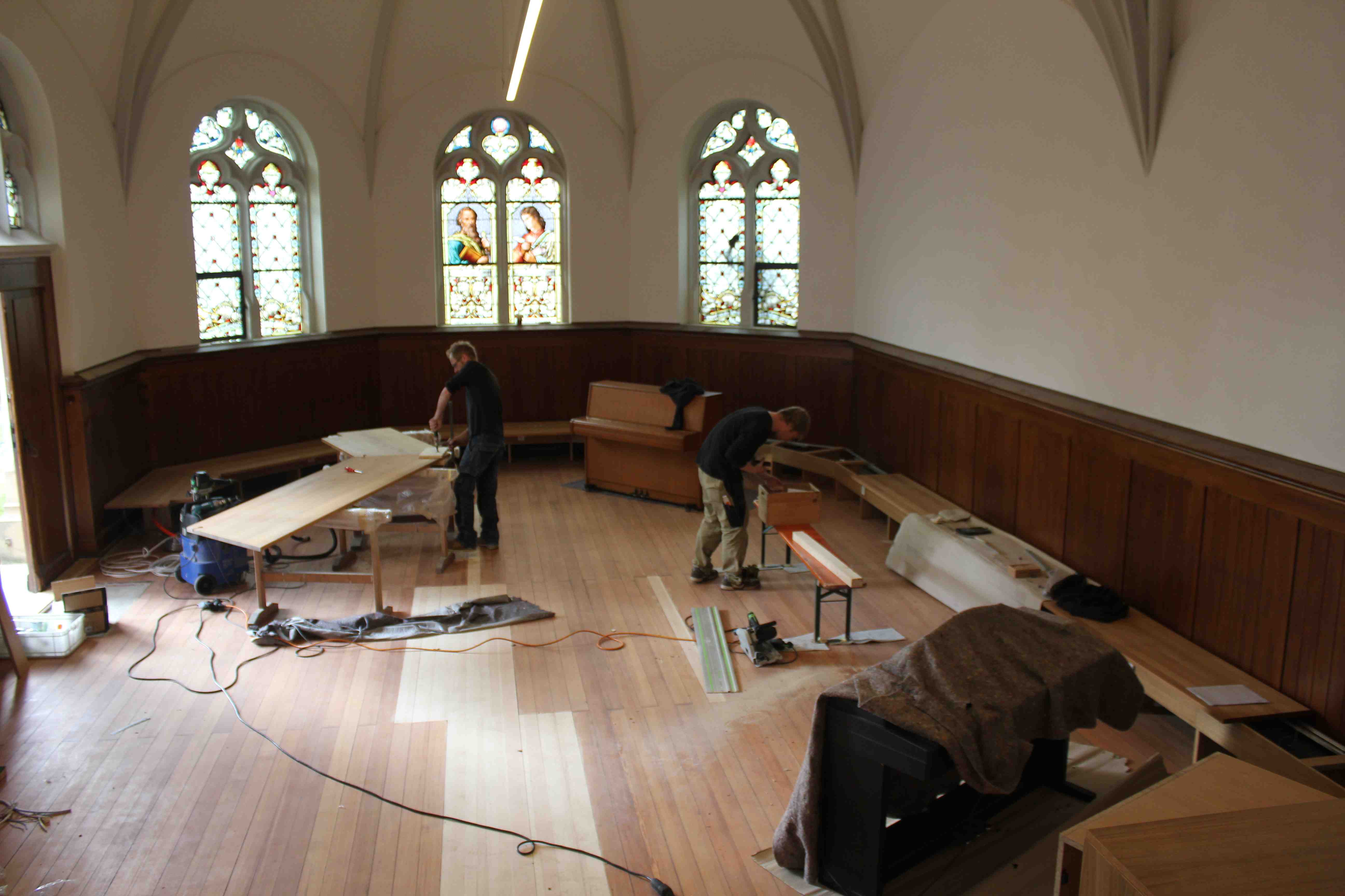 Bevor in der zweiten Wochenhälfte die Stühle geliefert werden, muss jedoch noch einmal geputzt werden! Am Mittwoch werden Sie gebraucht. Nutzen Sie die Gelegenheit, so zufrieden haben Sie vermutlich noch nie geputzt! Als Belohnung sehen Sie die fast fertige Kirche vor sich.