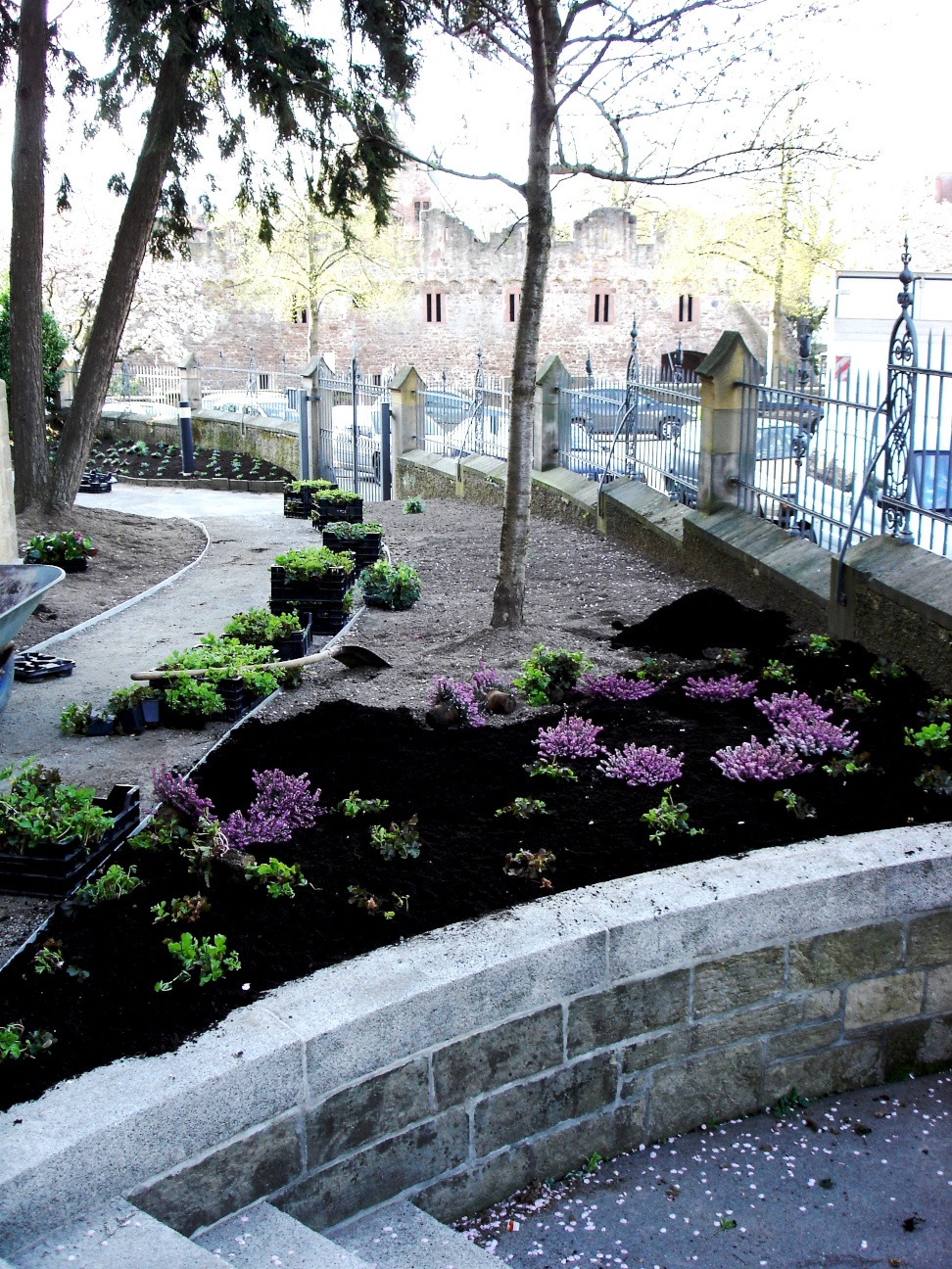 Auch rings um die neue Friedenskirche wächst nun neues Grün. Die Blumenbeete wurden neu gestaltet und neu bepflanzt. 2000 Pflanzen sind rund um die Kirche gesetzt worden.