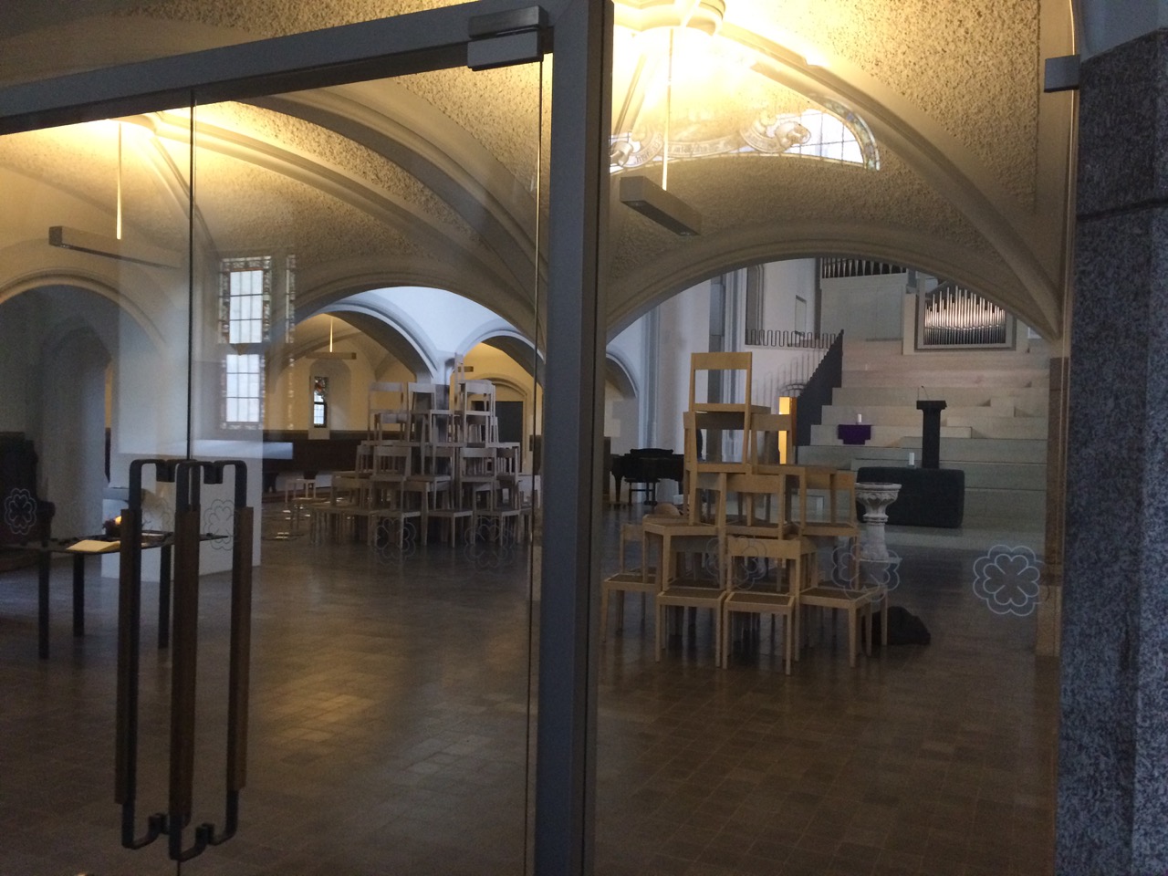 Die neue Friedenskirche: leer. Stühle an einigen Orten im Kirchenraum zu bizarren Hügeln aufgetürmt, bis unter die Bögen der Seitengewölbe.