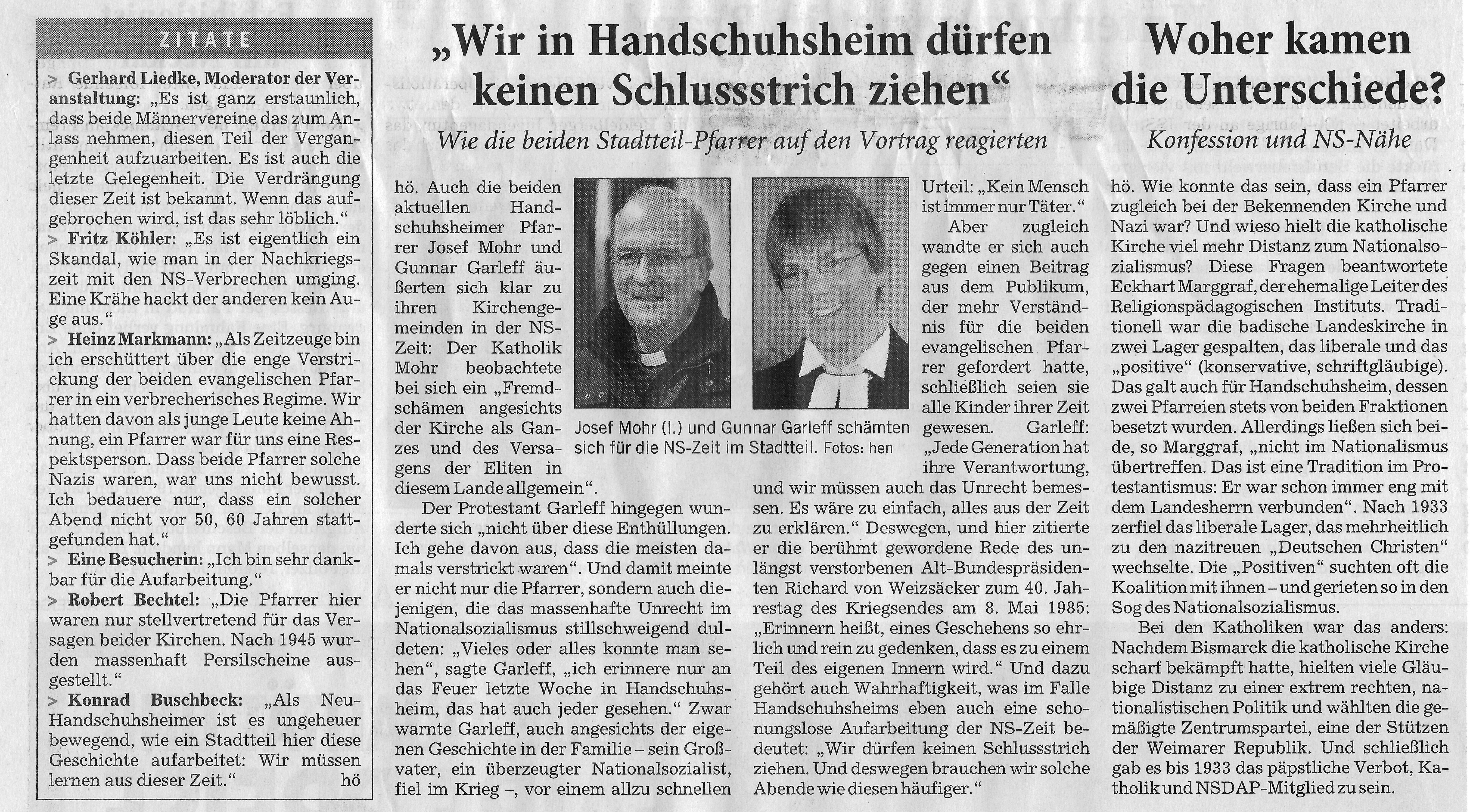 Der Evangelische Männerverein Handschuhsheim und der Katholische Männerkreis St. Vitus hatten aus Anlass der 1250-Jahr-Feier Handschuhsheims zu einem bemerkenswerten Vortrags- und Diskussionsabend eingeladen. Es ging um die Geschichte der Handschuhsheimer Kirchengemeinden und ihrer Pfarrer während der NS-Zeit. Einen ausführlichen Bericht von Rüdiger Runge finden Sie hier.
