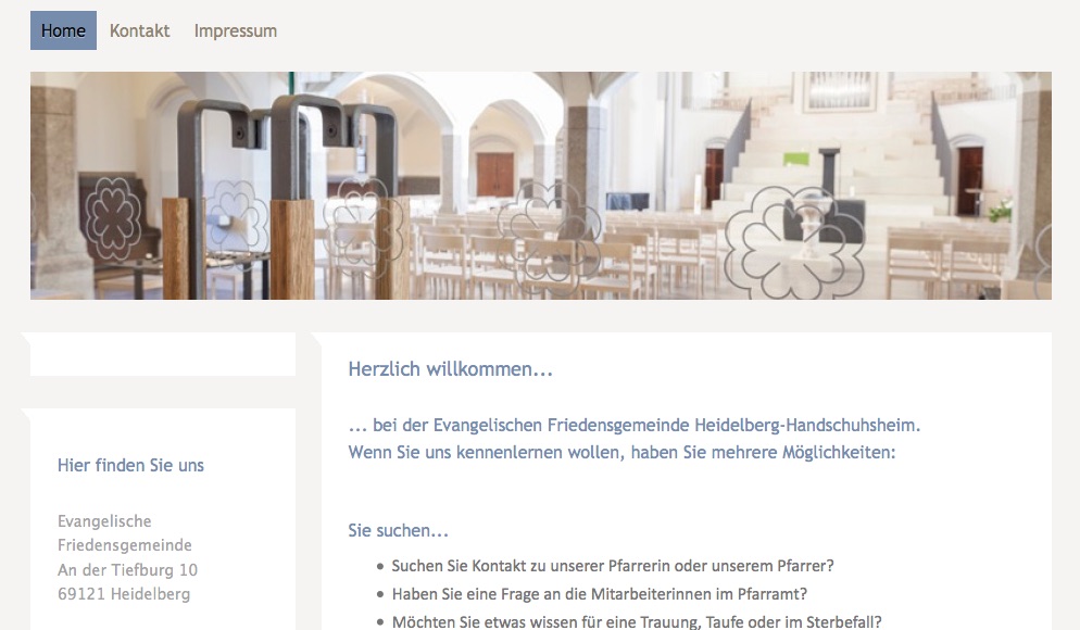Unter der Adresse www.friedensgemeinde-handschuhsheim.de finden Besucher jetzt eine schnelle Orientierung für weitere Informationen. Wer Kontakt zum Pfarramt sucht oder sich über Kasualien und Veranstaltungen informieren will, wird auf die „offizielle“ Homepage der Gemeinde weitergeleitet. Wer sich anhand von Texten und Bildern aktuell über das Gemeindeleben informieren will, kommt zu unseren Blogseiten. Dort ist auch die Möglichkeit, sich über große und kleine Fragen des Gemeindelebens in Kommentaren und Diskussionen auszutauschen.