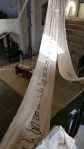 Vor der Schrift steht das Schreiben. Wir wollen nun mit den vier Schriftzitaten aus unseren Kirchenfenstern in ein Gespräch eintreten. Das soll in Form eines schweigenden Schreibgesprächs geschehen. Wir schreiben, wir tragen uns ein in die Schrift. Sie können nun einen Gedanken, eine Frage, einen Kommentar zu einem der Christusworte auf das jeweilige Band schreiben. Andere werden anderes aufschreiben. Oder lesen, was Sie geschrieben haben, und es ebenfalls kommentieren oder einen weiteren Gedanken dazu aufschreiben. So kommen wir mit der Bibel und miteinander ins Gespräch. Es soll bei diesem Gespräch aber nicht gesprochen, nicht geredet, sondern nur geschrieben und gelesen werden. Sie haben Zeit. Eine Glocke ist das Zeichen, dass wird unser Schreiben beenden. Und nun dürfen Sie sich in Bewegung setzen!