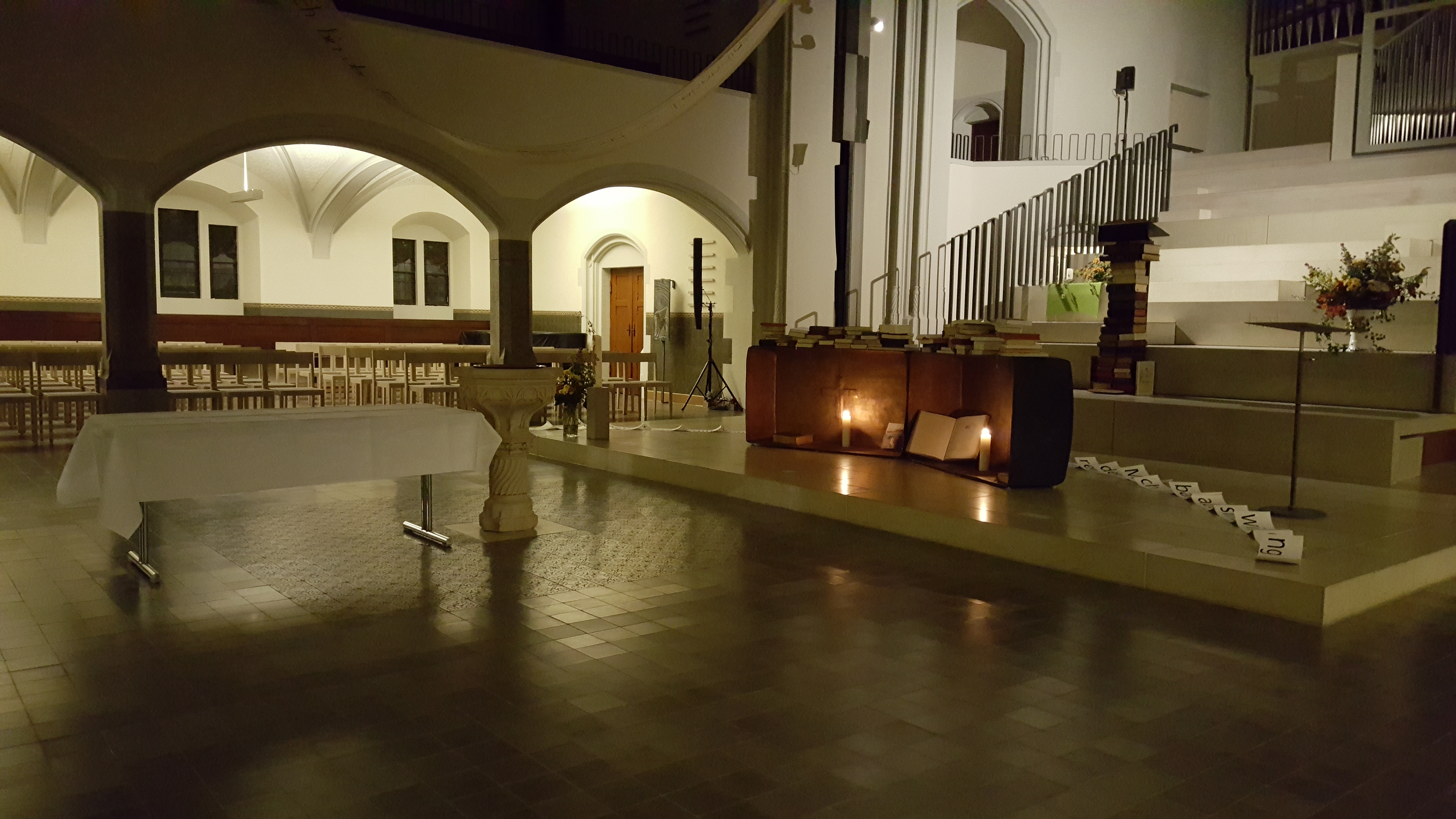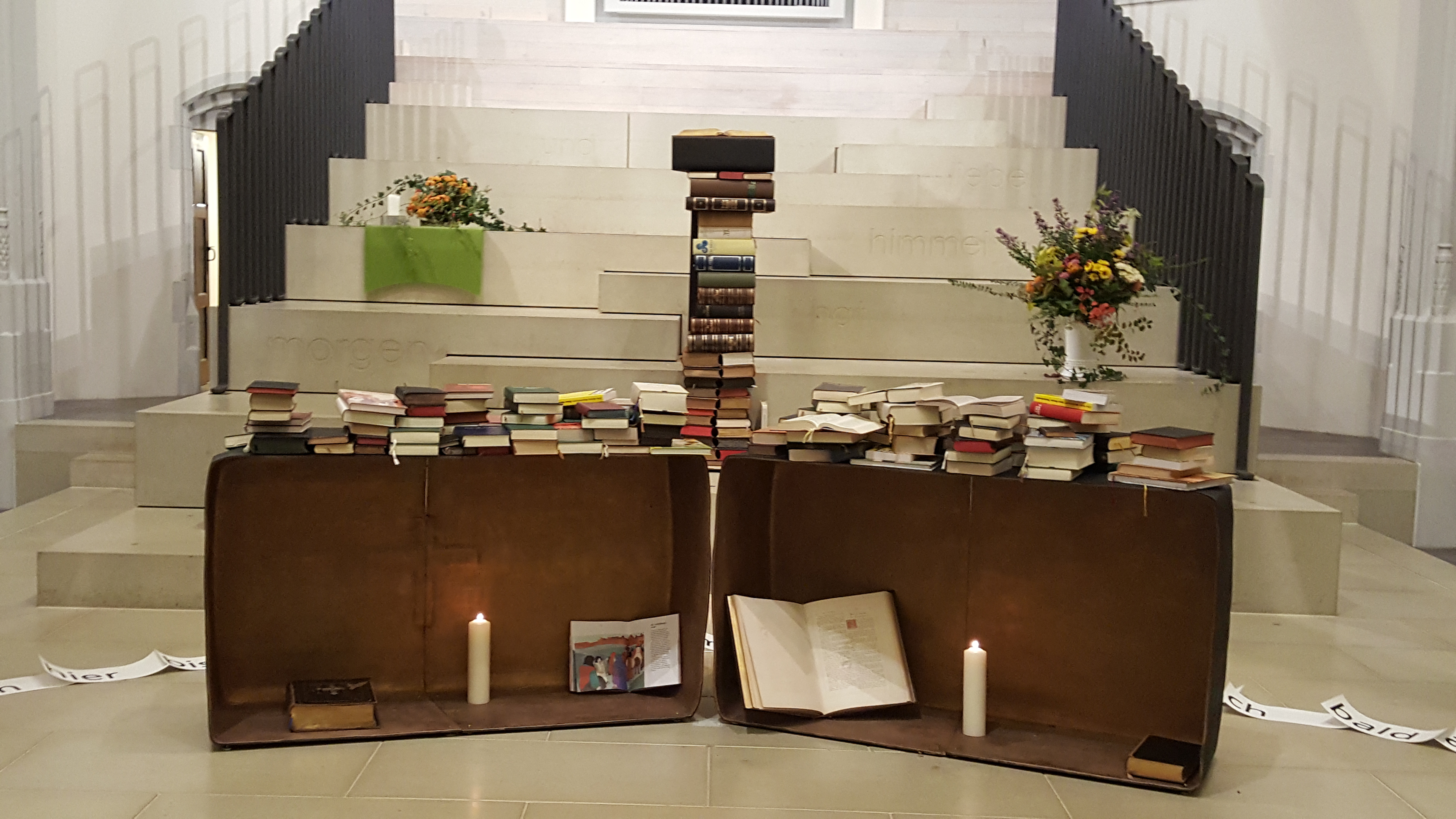 Die Friedenskirche aber ist um einer Installation reicher. Denn der Buchaltar und das „Zelt“ bleiben für eine Woche. Und immer wieder begegnen in dieser Zeit staunend-fragende Menschen in der Kirche der Schrift.