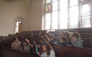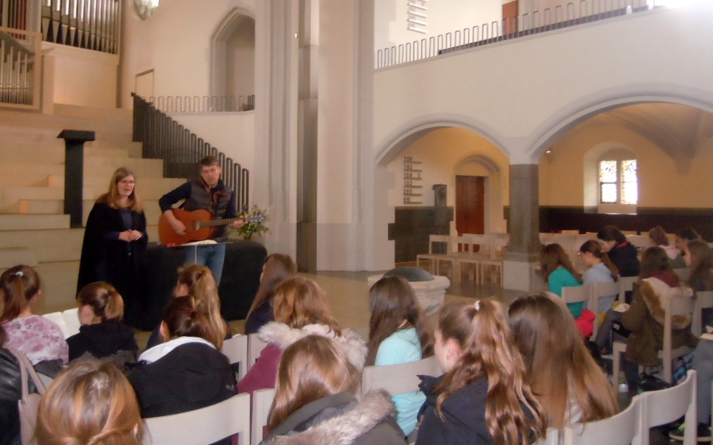 „Da es in Kirchen bekanntlich immer kalt ist“ (O-Ton Herr Garleff) machte Pfarrerin Reister-Ulrichs mit den Schülerinnen ein „Warm-up Spiel“, in dem die Mädchen durch „aufstehen“ bzw. „sitzen bleiben“ die ihnen über Luther gestellten Fragen beantworten mussten. In spielerischer Form konnten die Schülerinnen hierbei ihr bereits erworbenes Wissen über Martin Luther unter Beweis stellen. Die teilweise recht originell gestellten Fragen (z.B. Stimmt die Aussage: „Auf der Wartburg in Eisenach nannte man Luther Ritter Rost“) und das „Auf und Ab“ trugen nicht nur dazu bei, dass den Mädchen warm wurde, sondern auch dass das Eis zwischen den Schülerinnen und den beiden Pfarrern recht schnell gebrochen werden konnte.