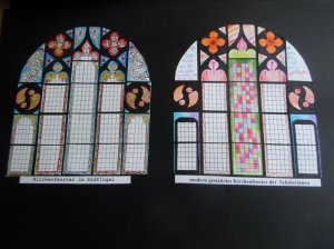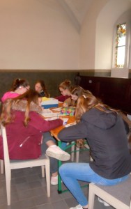 Während die Mädchen in den Seitenschiffen in Stationsarbeiten ihr eigenes „Lutherbuch“ zusammenstellen konnten, wurden auf der Empore zwei weitere Gruppen unter Anleitung von Frau Topp und Frau Burggraf künstlerisch aktiv. Hier galt es zwei Kirchenfenster zu kopieren, bzw. eigene, moderne Kirchenfenster zu gestalten.