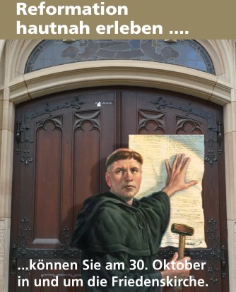 Am Vorabend des 500. Jahrestages der #Reformation macht sich in der Friedenskirche Martin Luther noch einmal mit einem Hammer auf den Weg, um seine Thesen an ein Tor zu schlagen und damit Kirche und Welt zu verändern.