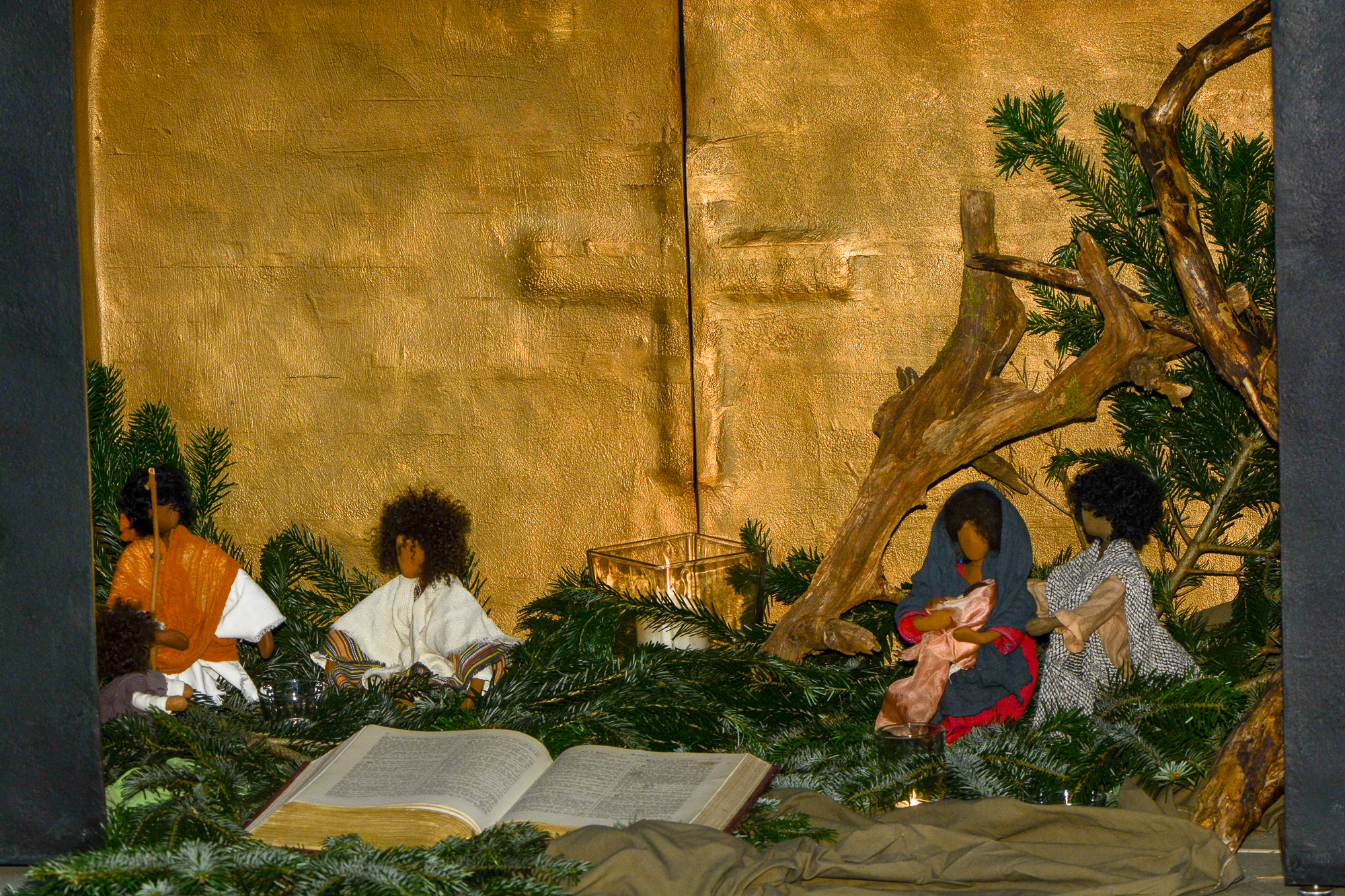 Und die Türen und die Tore sind weit und hoch auch in der Friedenskirche. Wenn Weihnachten vor der Tür steht, herrscht adventliche Anspannung und Vorfreude. Die Kirche verwandelt sich in Bethlehem mit Tannenbaum.