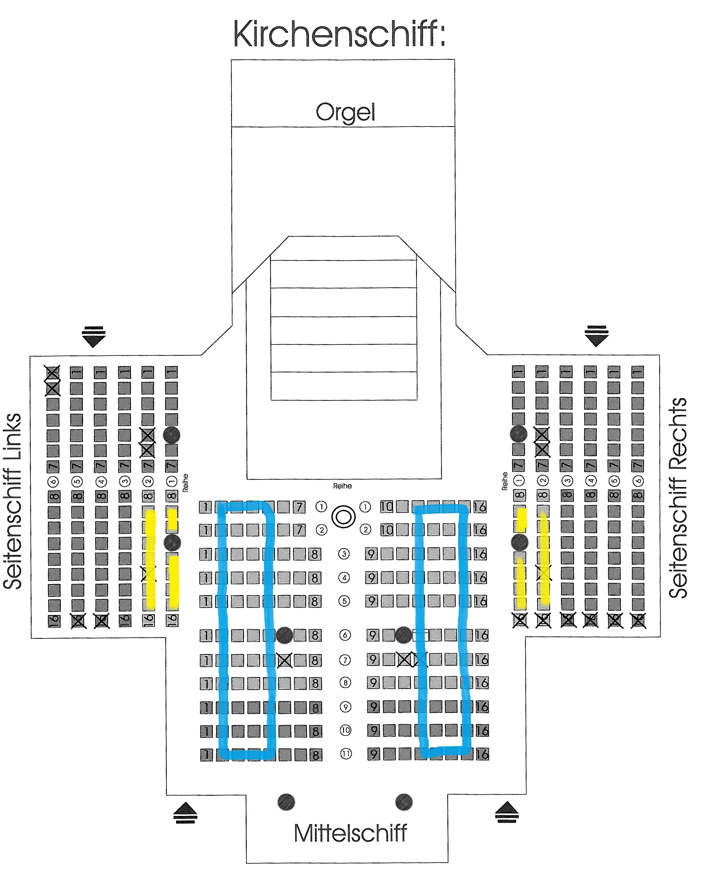 Im Zuge der Arbeiten wurde auch die Induktionsschleife in der Friedensgemeinde getestet. Diese führt in einem Bogen von der linken Stele zur rechten um das gesamte „Mittelschiff“ der Kirche. Auf dem Bestuhlungsplan sind die sehr gut ausgesteuerten Plätze blau markiert. Gelb markiert sind die Plätze, wo die gemessene Aussteuerung ebenfalls sehr gut ist.