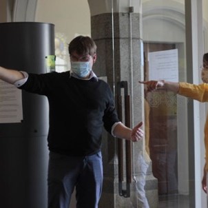 Beim Betreten der Kirche müssen die Hände desinfiziert werden und ein Mund-Nasen-Schutz getragen werden.