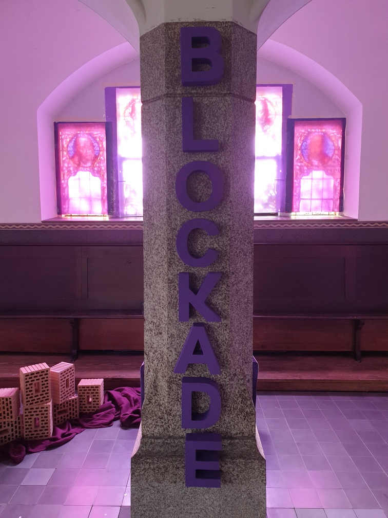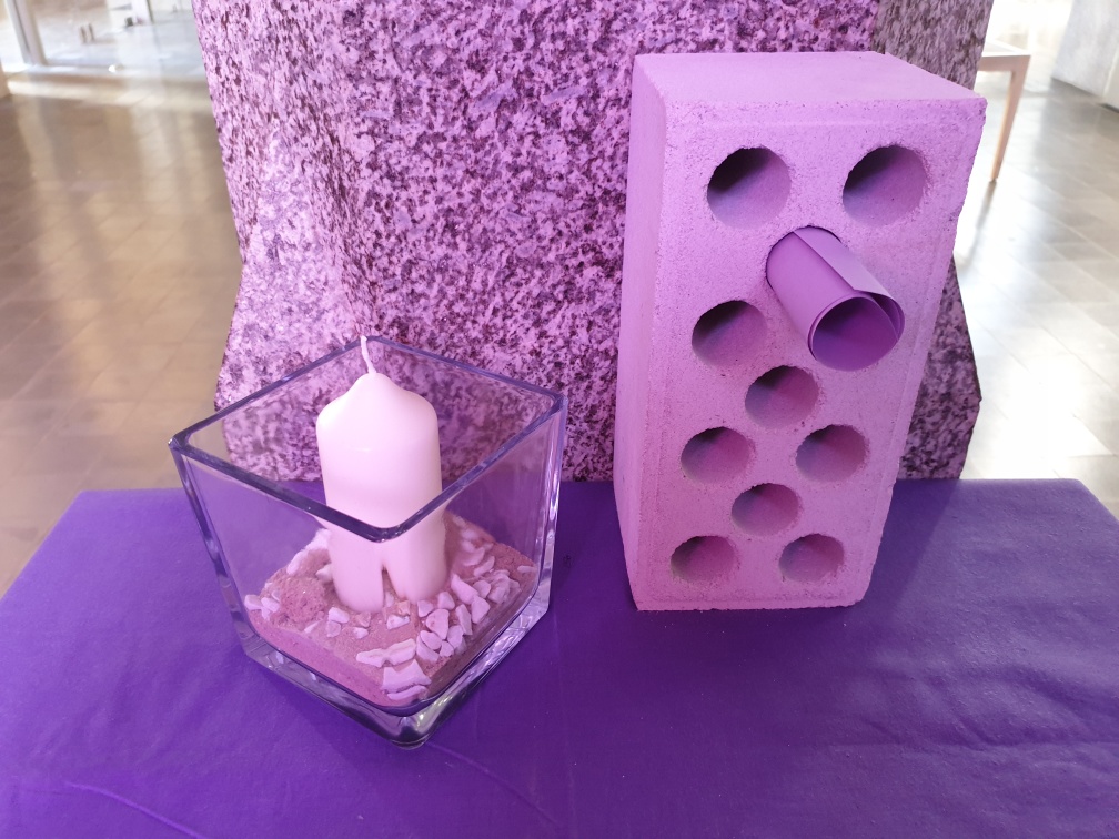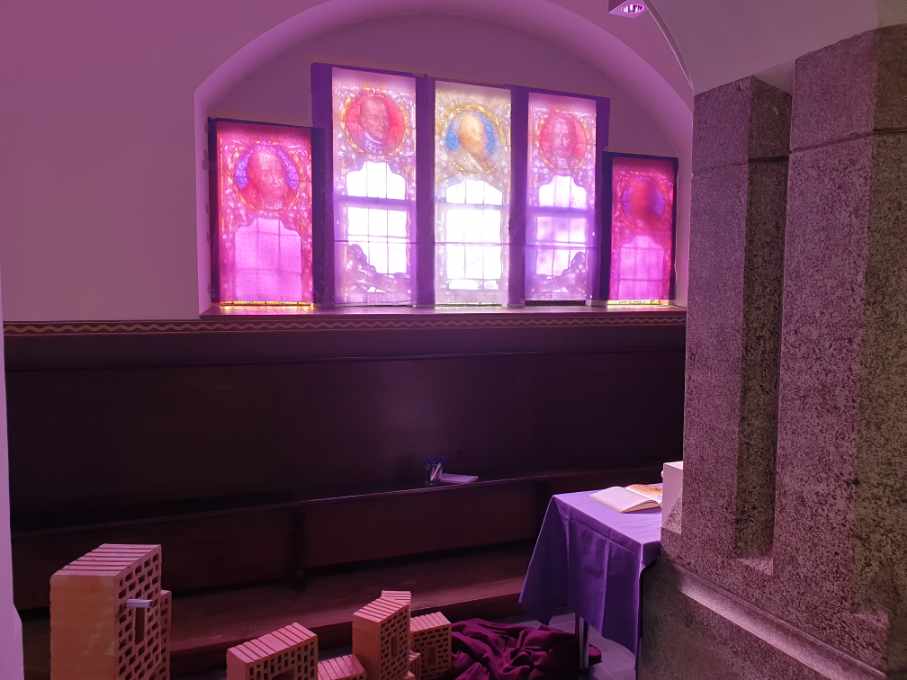 Im gegenüberliegenden Bereich der Kirche leuchtet der Raum im dunklen Violett der Passionszeit. Hier können Sie sich all der inneren und äußeren Blockaden bewusstwerden, die Sie einschränken, und überlegen, wie sich die eine oder andere abbauen lässt.