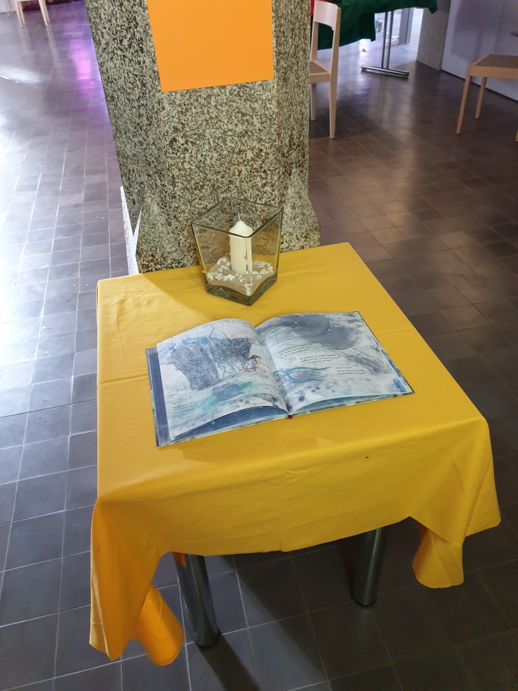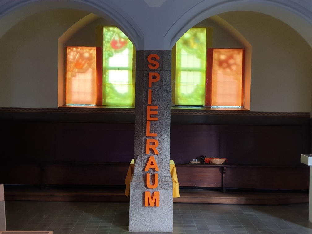 Im Bereich unter der Westempore lädt ein in helles Licht getauchter Spielraum dazu ein, auch in einer Zeit, die von vielerlei Einschränkungen bestimmt ist, kleine und große Spielräume für sich zu entdecken und diese Entdeckungen mit anderen zu teilen.