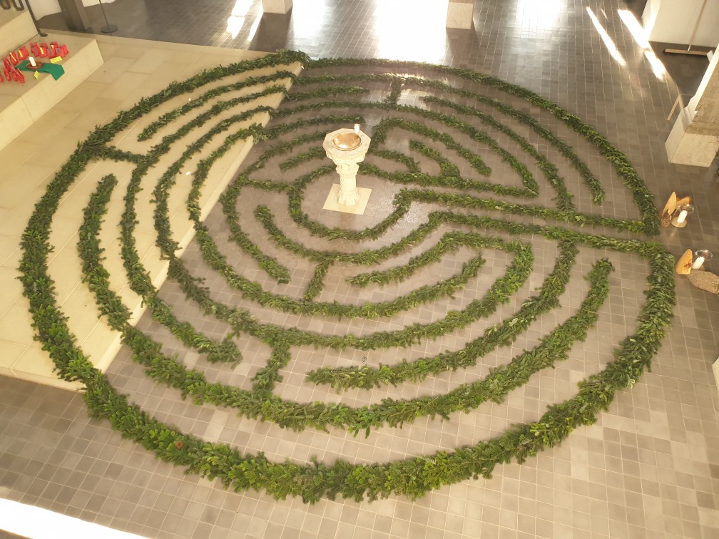 „Glaube,“ so sagte eine von euch: „heißt für mich Vertrauen in Gott und das Wissen, dass er mir zuhört, wenn ich Probleme habe.“ Und dieser Glaube ist immer auch ein Glaube der Umwege, der Zweifel. So wie auch Gottes Wege zu den Menschen, ja Gottes Schöpfungsträume immer wieder krumm werden durch die Wirklichkeit der Welt. Das Labyrinth in unserer Mitte ist gerade dafür ein Zeichen. Die Verheißung, die Gnadenzusage ist in seiner Mitte. Aber der Weg dahin und davon ist nicht gerade, es ist ein Weg der Biegungen, der Umkehrungen, der Wendungen, der Umwege. Gott kommt immer nur auf krummen Wegen. Und doch steht in seinem Zentrum der Ort der Gnadenzusage der Annahme, der Ort lebendigen Wassers. Die Taufe. Und es ist der Ort, da der Glaube sich ereignen möge.