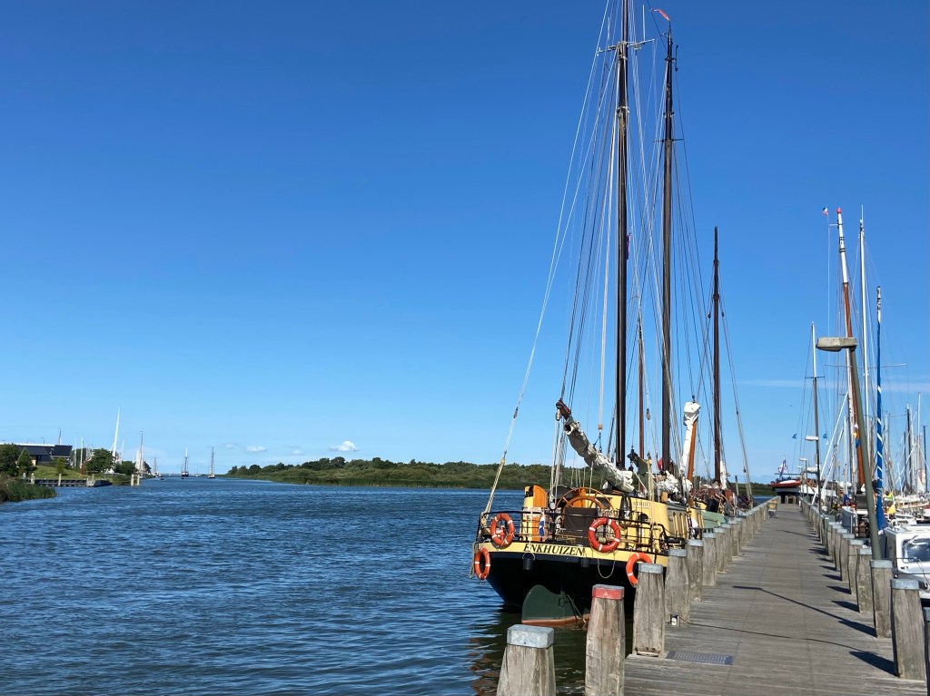 Unter wolkenlosem Himmel war die Fahrt am Morgen in Makkum an der Ostküste des Ijsselmeeres losgegangen. Nach einem Zwischenstop in Stavoren zum tanken und einkaufen frischte der nordwestliche Wind etwas auf, das Meer schimmerte grün und das Schiff schaukelte bei seitlichen Wellen mit mehr Schräglage als sonst. Für viele ein tolles Segelgefühl, manchen wurde ein bisschen flau in der Magengegend.