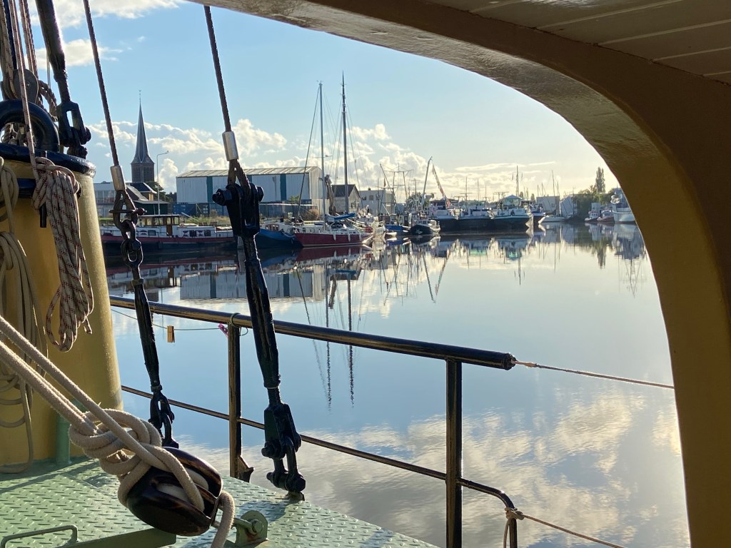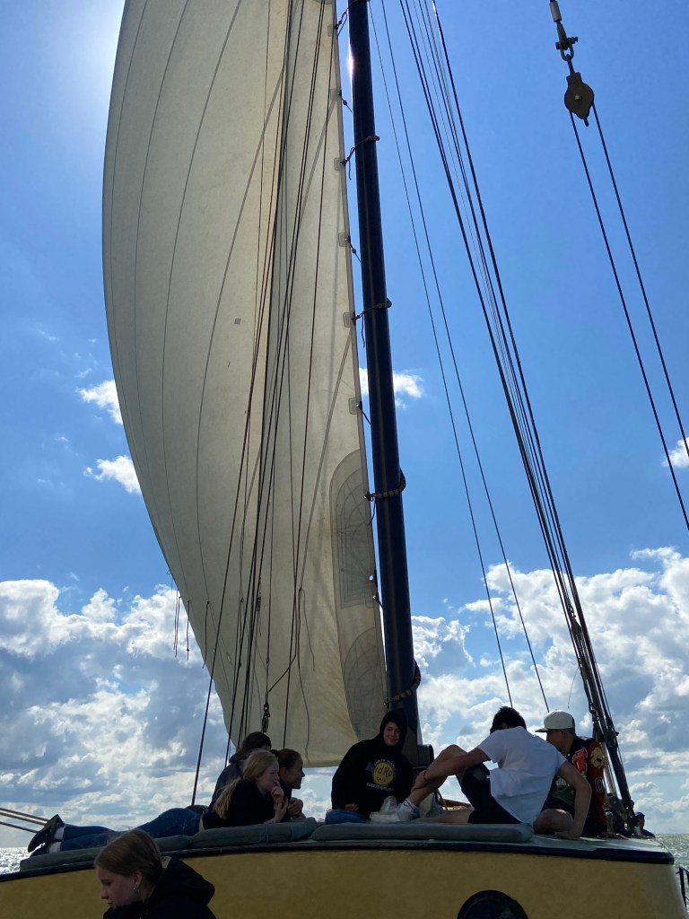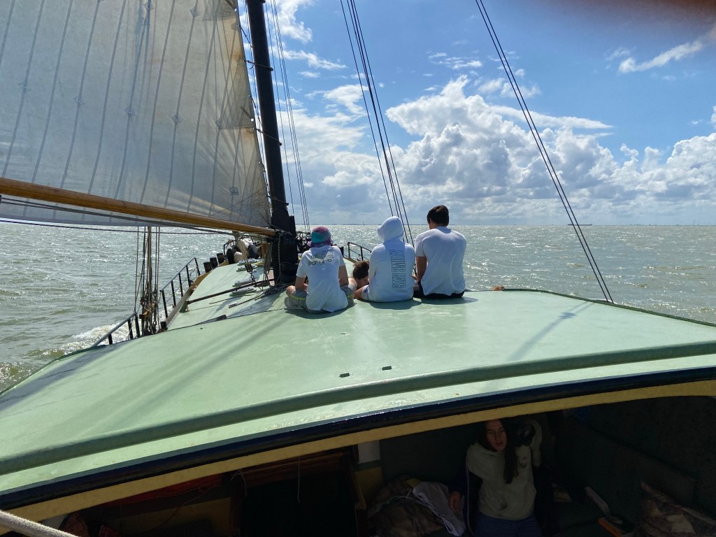 Als Skipper Klaasjan dann aber Kurs nimmt auf den Zielhafen Lemmer, haben wir Wind und Welle von hinten. An Deck macht sich entspannte Stimmung breit.