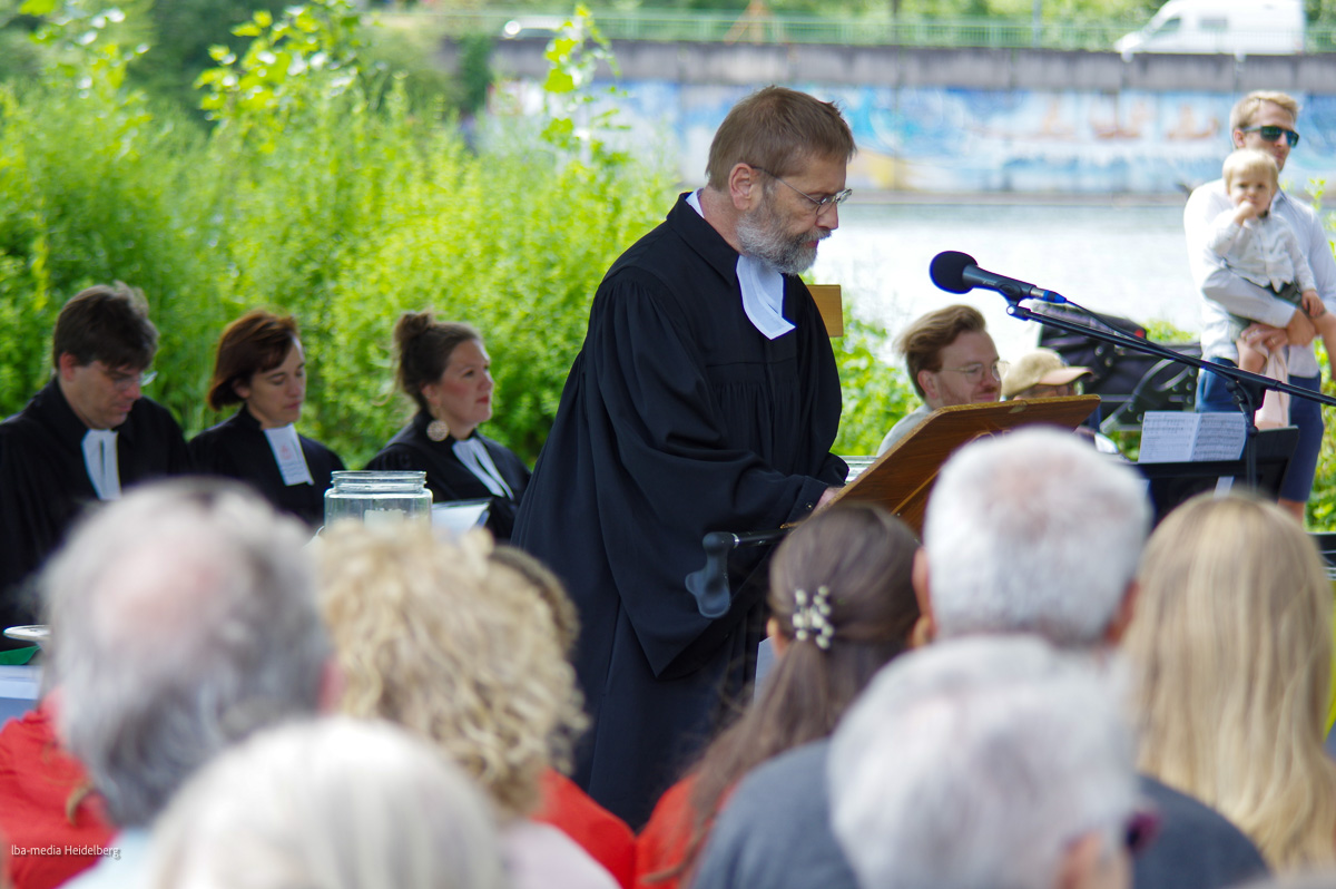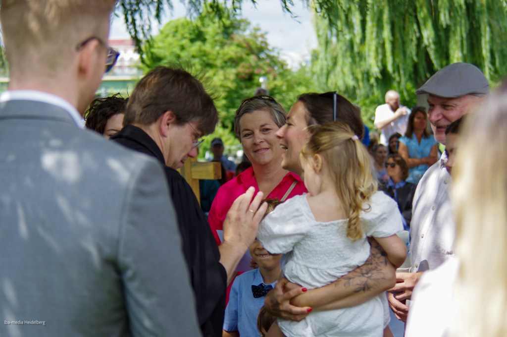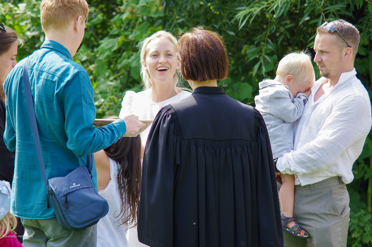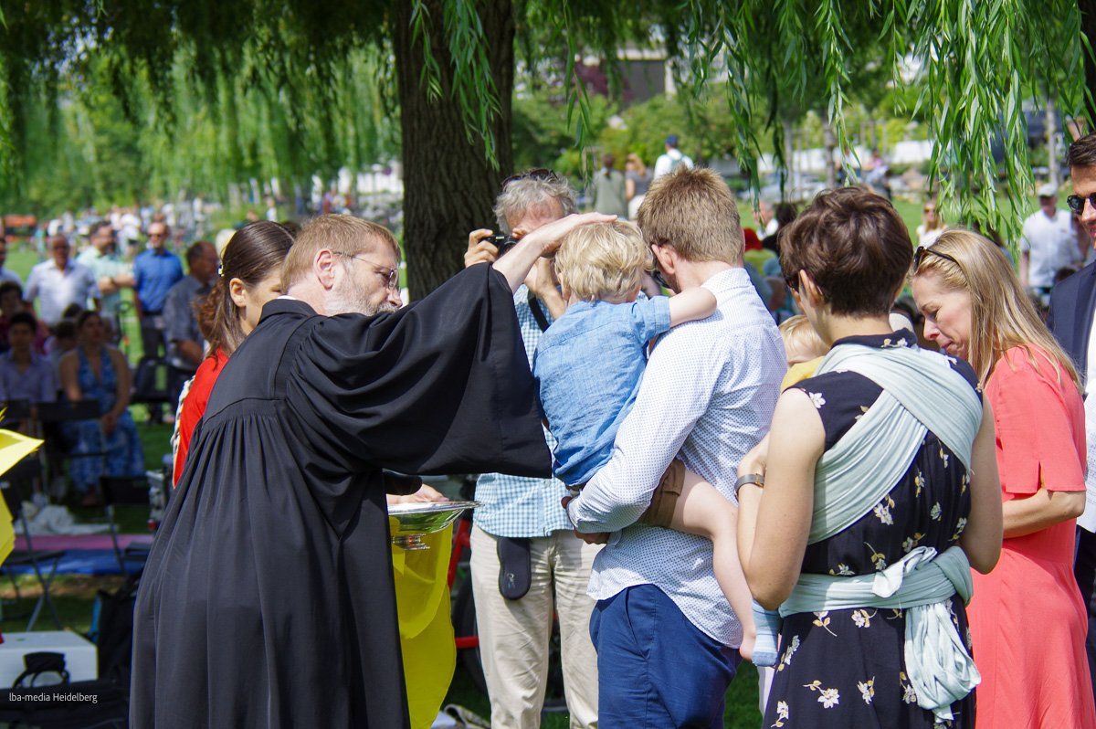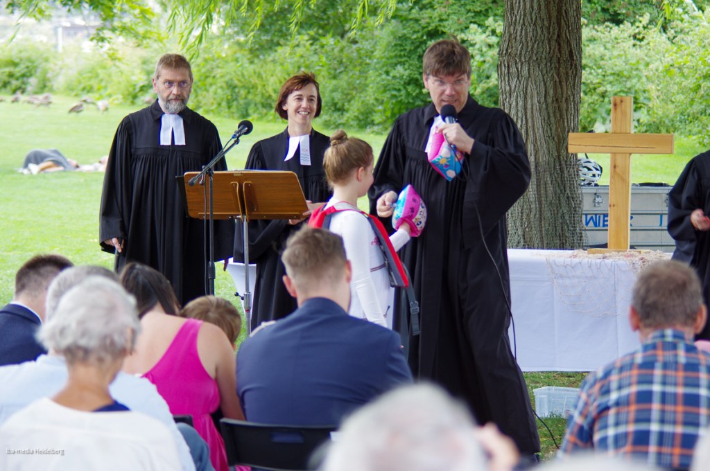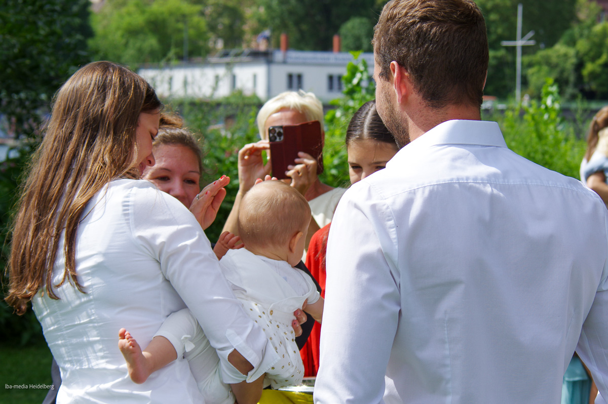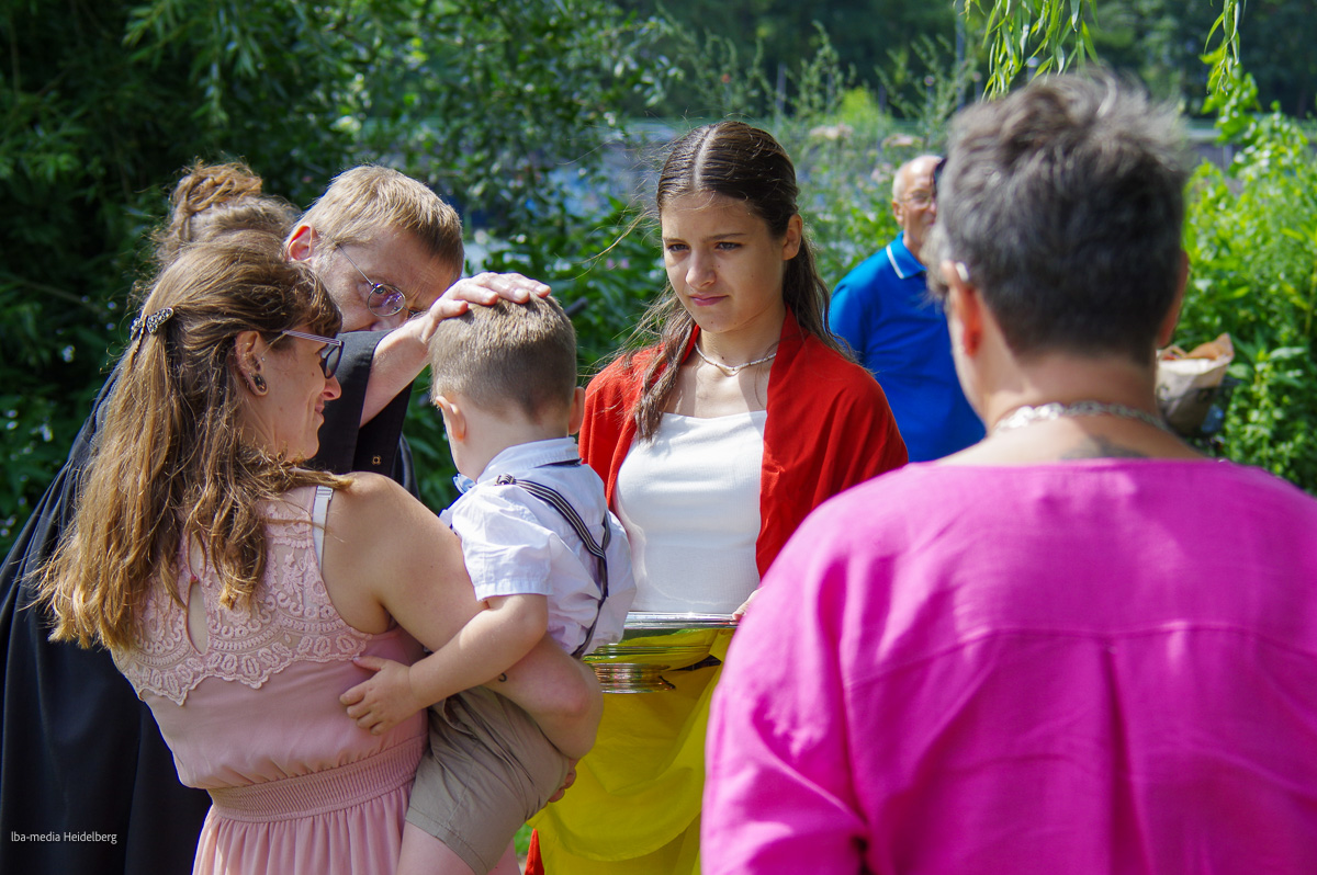 Sieben Wochen nach Pfingsten steht im liturgischen Kalender die Feier der Taufe besonders im Mittelpunkt. Schon in einer alten urchristlichen Kirchenordnung, der so genannten Didache, gibt es die Weisung, dass man in fließendem, lebendigem Wasser taufen soll. Deshalb zogen die drei evangelischen Gemeinden im Heidelberger Norden ans Neckarufer und feierten ein großes Tauffest. Für die Tauffamilien, Freundinnen, Freundinnen und Angehörige war es an einem sonnigen Sonntagmorgen im Schatten eines großen Baumes ein fröhliches, ungezwungenes Zusammensein.
