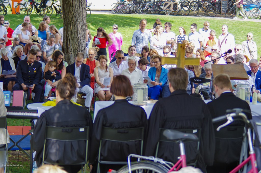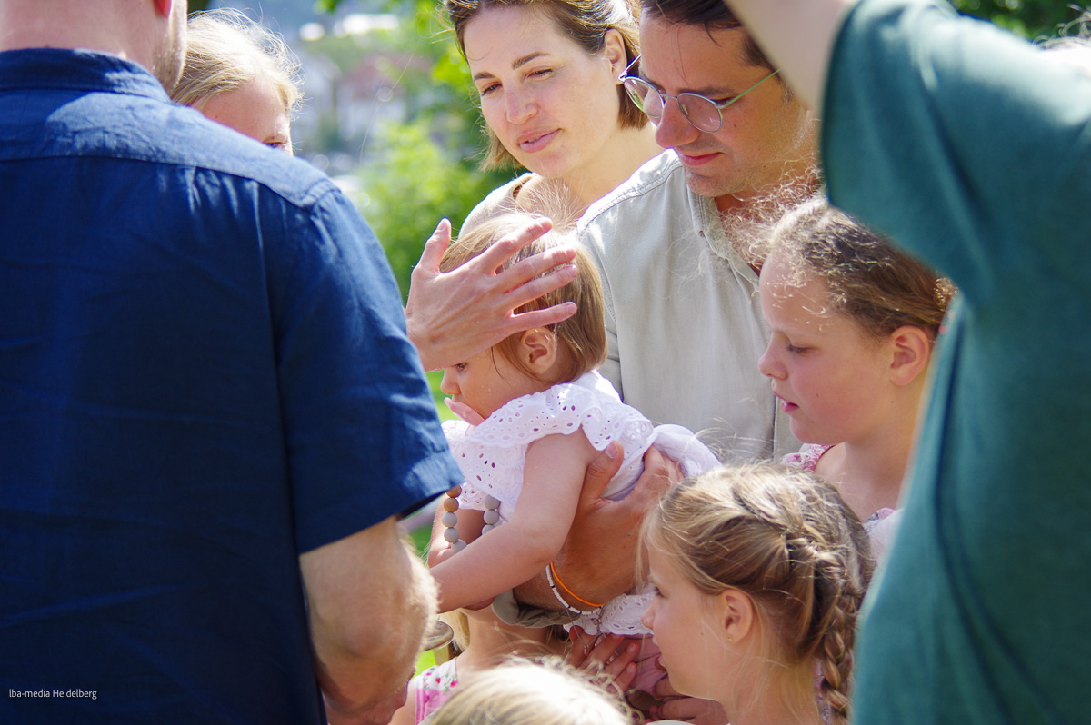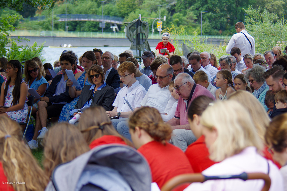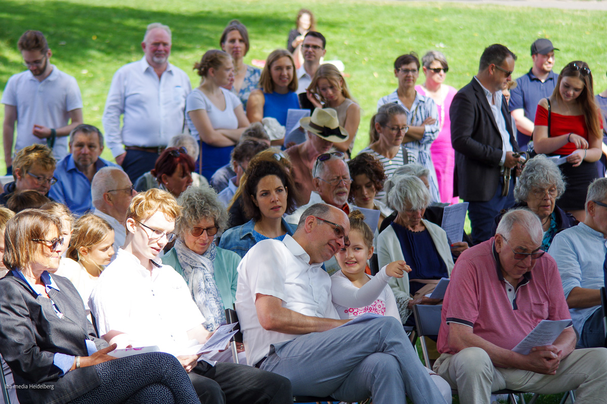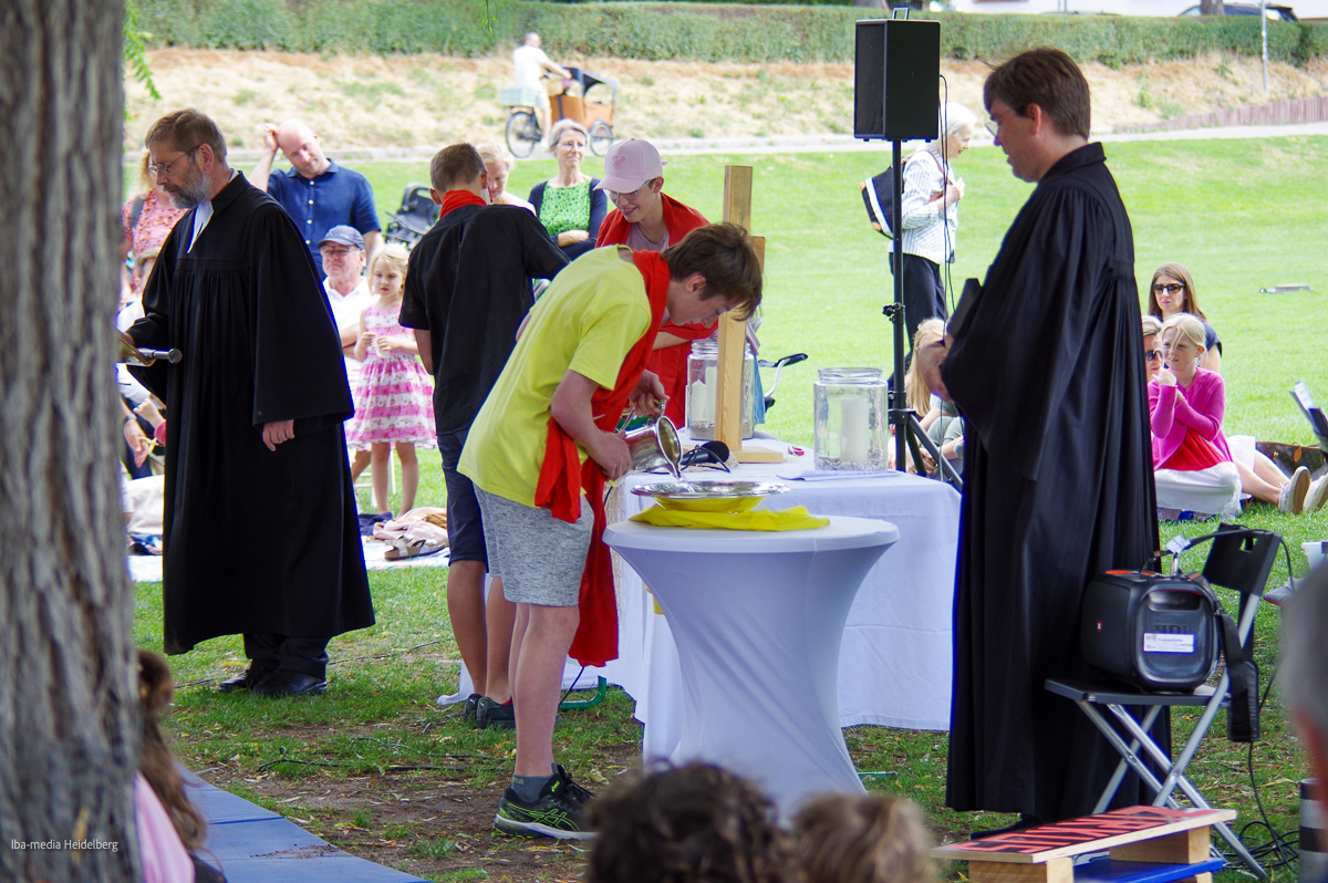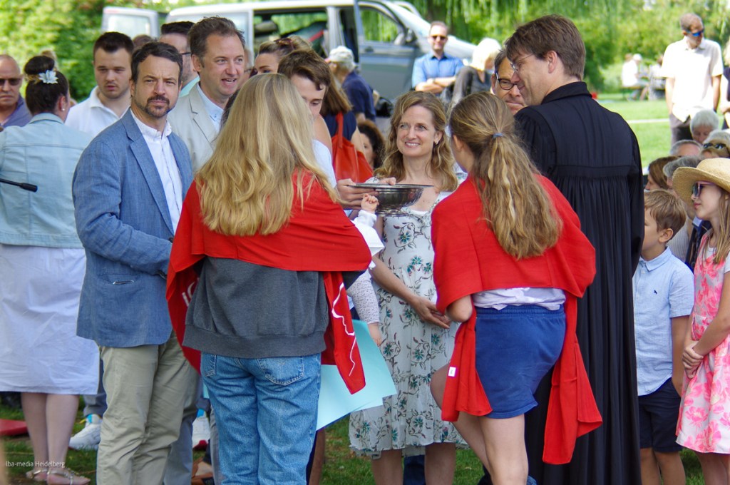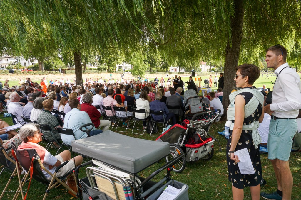 Sieben Wochen nach Pfingsten steht im liturgischen Kalender die Feier der Taufe besonders im Mittelpunkt. Schon in einer alten urchristlichen Kirchenordnung, der so genannten Didache, gibt es die Weisung, dass man in fließendem, lebendigem Wasser taufen soll. Deshalb zogen die drei evangelischen Gemeinden im Heidelberger Norden ans Neckarufer und feierten ein großes Tauffest. Für die Tauffamilien, Freundinnen, Freundinnen und Angehörige war es an einem sonnigen Sonntagmorgen im Schatten eines großen Baumes ein fröhliches, ungezwungenes Zusammensein.