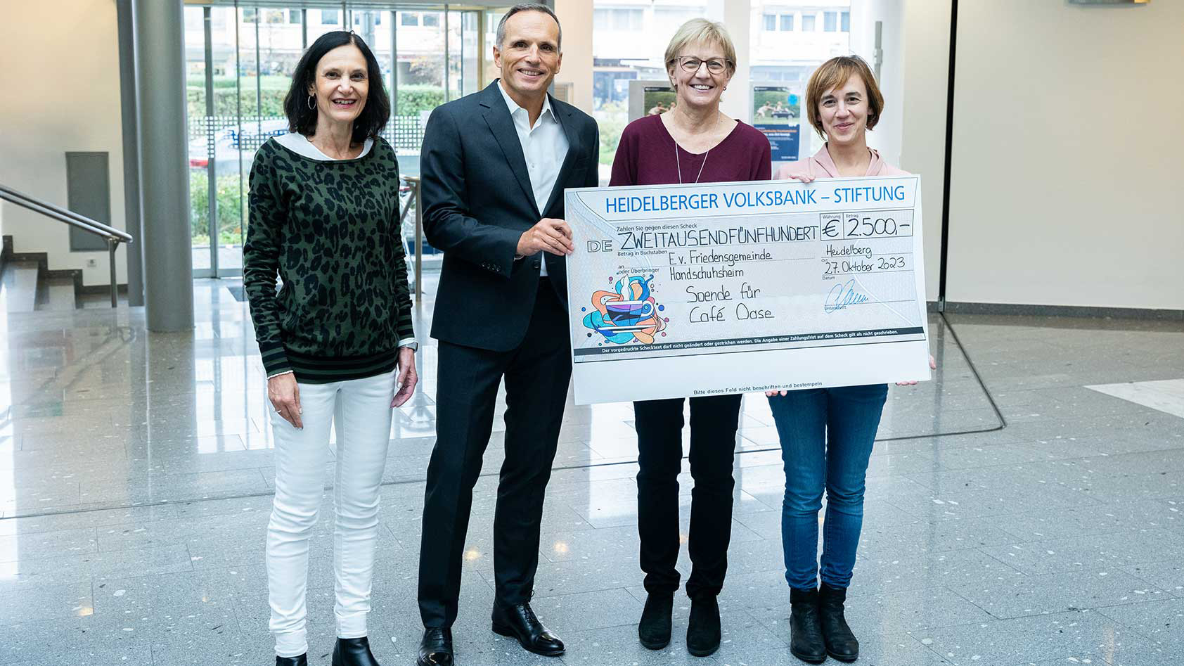 Von der Stiftung der Heidelberger Volksbank waren wir am 25.10.2023 zur Übergabe einer Spende in Höhe von 2.500 € für das Café Oase eingeladen. Pfarrerin Therese Wagner und ich haben gemeinsam den Scheck entgegengenommen und bedanken uns an dieser Stelle nochmals herzlich für die finanzielle Unterstützung für unser Café Oase.