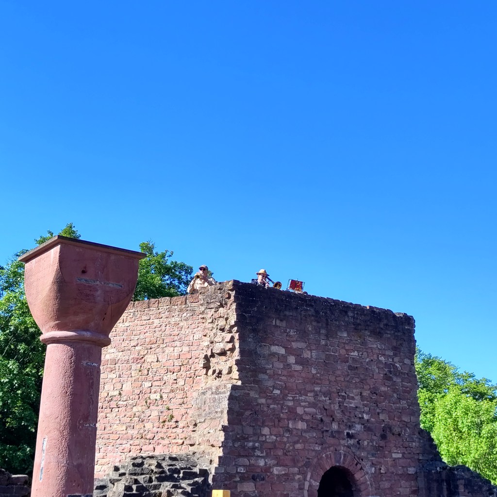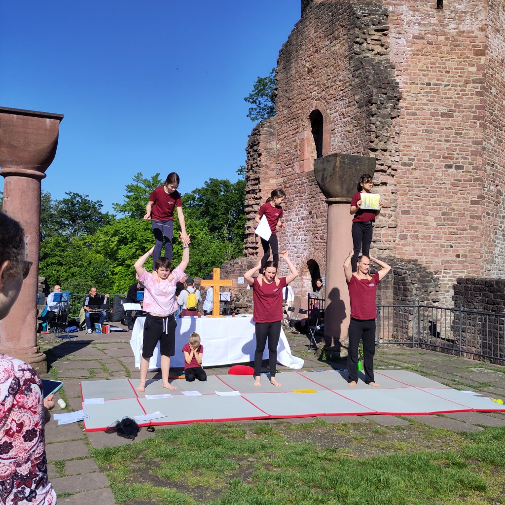 Ganz oben vom Turm erklingt der Klang der Trompete: „Lobet und preiset ihr Völker den Herrn“. Zwei weitere Blasinstrumente steigen ein, als Kanon schallt es vom Turm der Michaelsbasilika auf dem Heiligenberg hinunter. Der Morgenhimmel ist blau, Eidechsen huschen in die Ritzen der alten Steinmauern. Die Matten für den Zirkus sind ausgerollt. Noch schnell die Stühle aufstellen und alles ist bereit für den gemeinsamen Gottesdienst der Kooperationsregion an Christi Himmelfahrt.