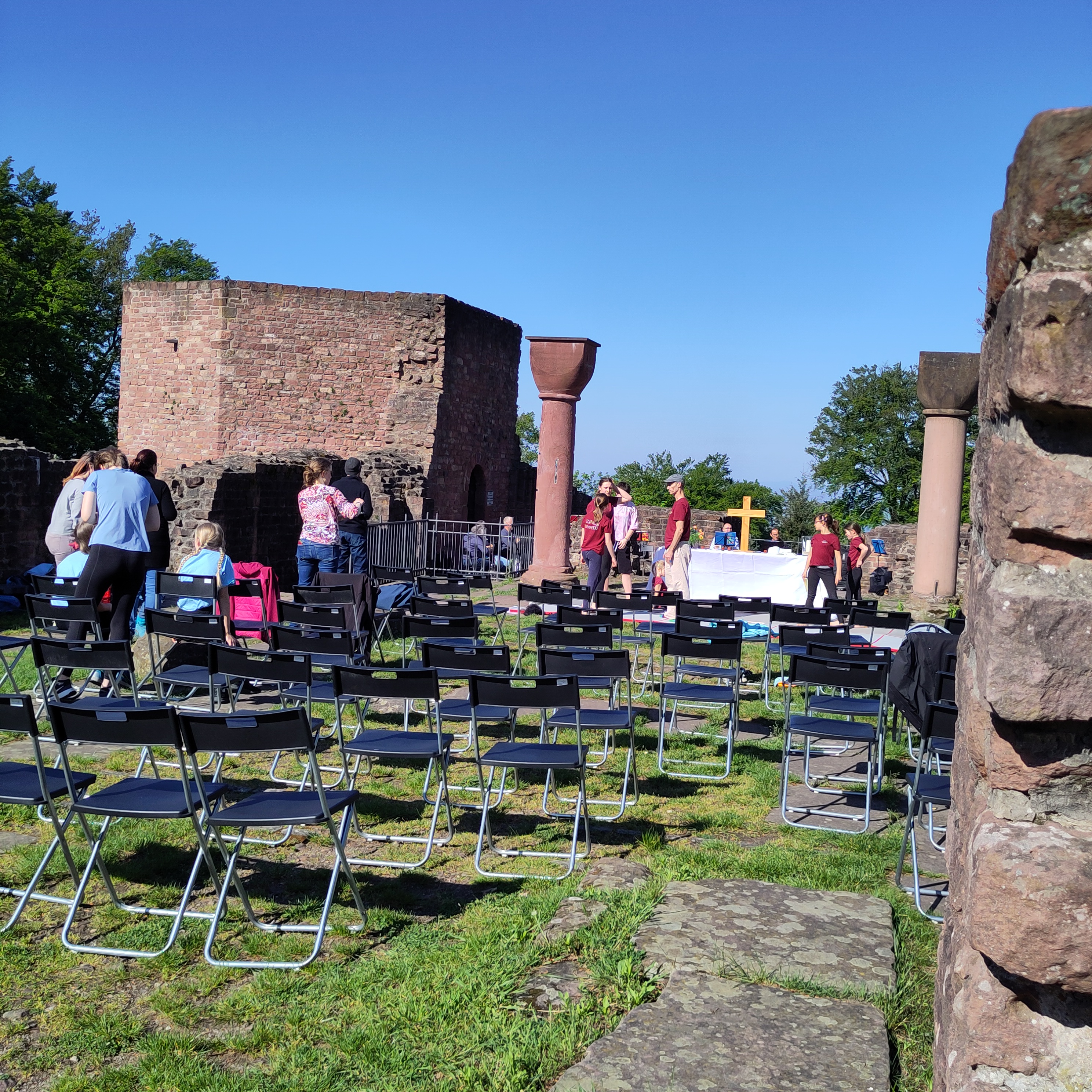 Ganz oben vom Turm erklingt der Klang der Trompete: „Lobet und preiset ihr Völker den Herrn“. Zwei weitere Blasinstrumente steigen ein, als Kanon schallt es vom Turm der Michaelsbasilika auf dem Heiligenberg hinunter. Der Morgenhimmel ist blau, Eidechsen huschen in die Ritzen der alten Steinmauern. Die Matten für den Zirkus sind ausgerollt. Noch schnell die Stühle aufstellen und alles ist bereit für den gemeinsamen Gottesdienst der Kooperationsregion an Christi Himmelfahrt.