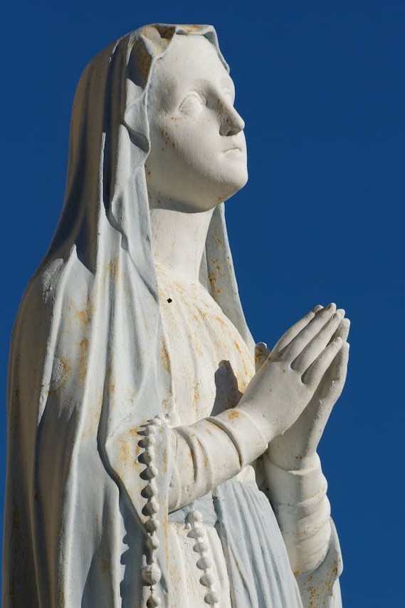 „Maria – das erste Bild, das ich vor mir sehe, ist das Gipswesen aus der Grotte von Lourdes, niedergeschlagene Augen, der Körper bis zur Unkenntlichkeit verhüllt: Entsexualisierung plus Demut, […] das weibliche Ideal. Sie thront über uns. Sie ist rein, wir sind schmutzig. Wir können sie nie erreichen. […]