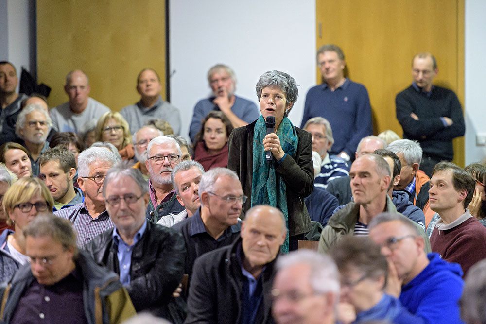 Bei der Podiumsdiskussion zum Masterplan Neuenheimer Feld im Gemeindesaal der Friedenskirche zeigt sich: Die überwiegende Mehrheit der Bürger möchte keine Ausdehnug der Universität über den Klausenpfad hinaus nach Norden. Dies bringen Bürger auch in Wortmeldungen vor, darunter Elke Koppert von der Gärtnerei Wiesenäcker.